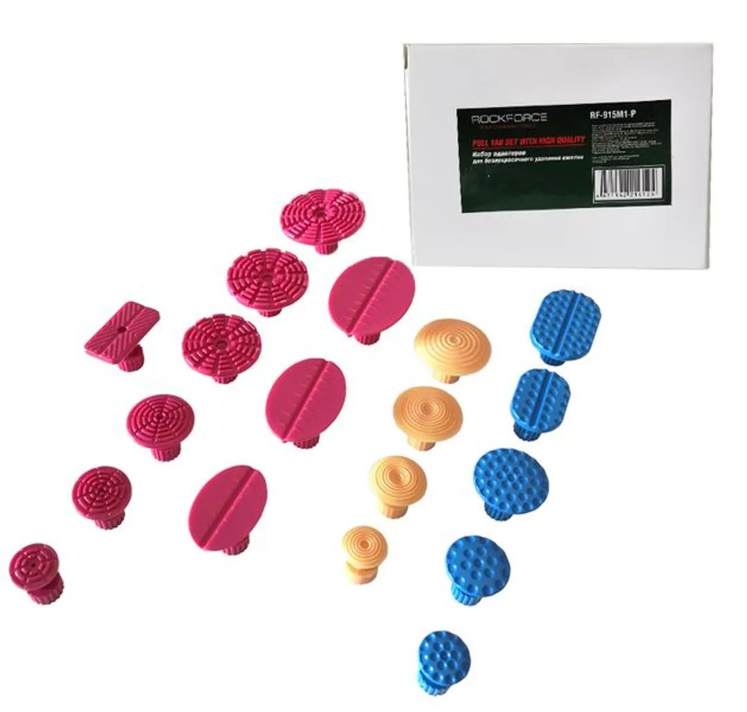 Набор пластиковых адаптеров для беспокрасочного удаления автомобильных вмятин включает в себя 19 различных предметов, которые помогут легко и безопасно устранить вмятины на кузове автомобиля. Адаптеры изготовлены из высококачественного пластика, который обладает прочностью и долговечностью. Они легко монтируются на поврежденную область и обеспечивают надежную фиксацию для эффективного удаления вмятин. Набор подходит для использования на различных типах автомобилей и может быть использован как профессионалами, так и любителями.