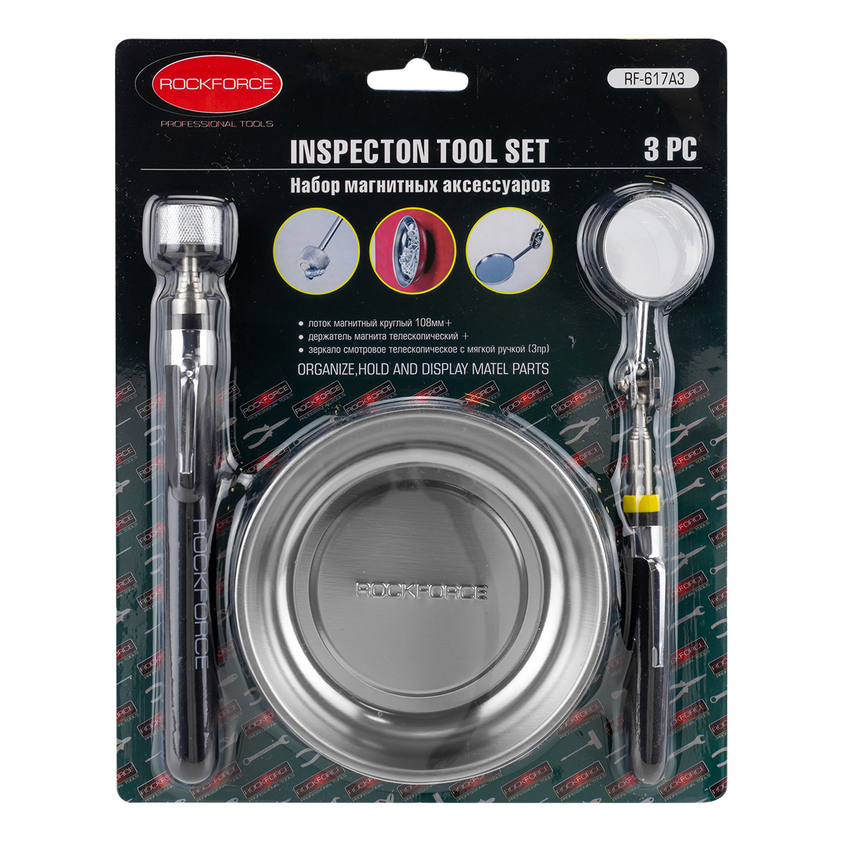 Набор аксессуаров магнитных, 3пр.(лоток-диам.108мм, зеркало смотровое телескопическое:диам.30мм L170-490мм; магнит телескопический; L:160-850мм), в блистере