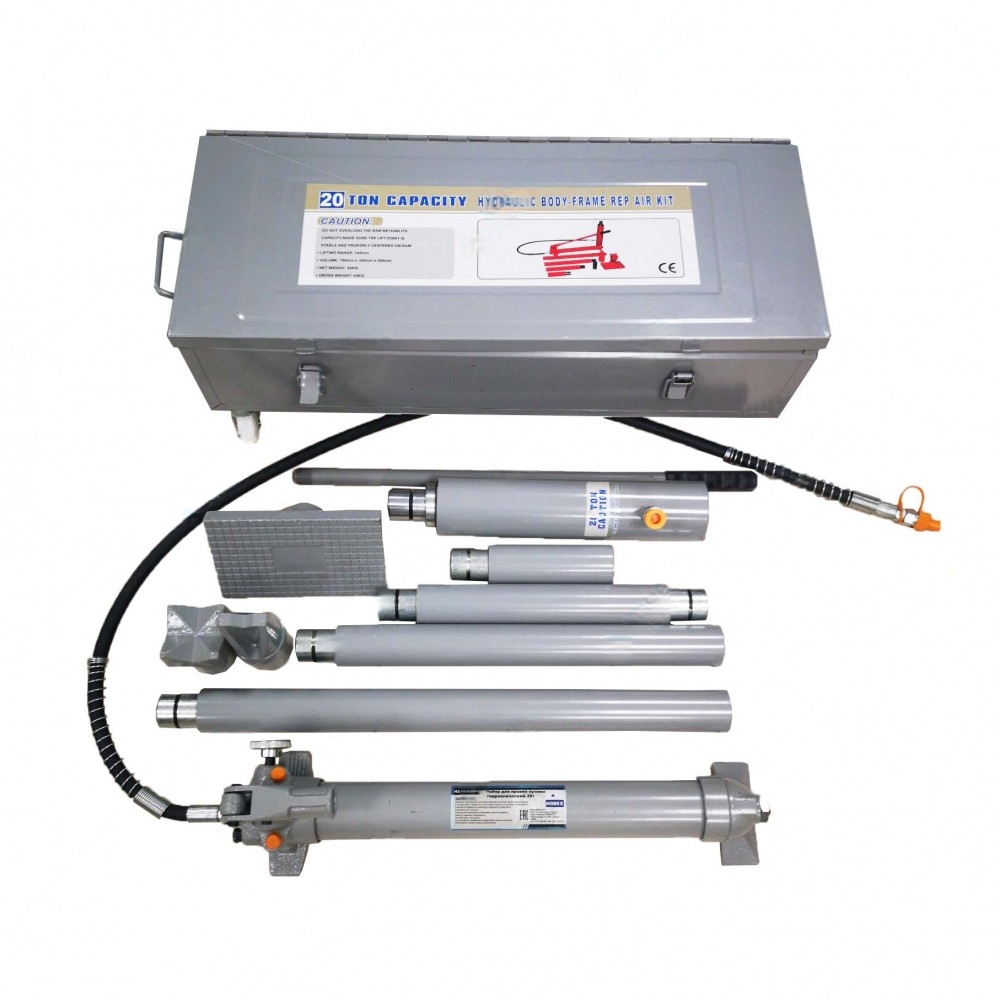 Гидравлический насос со шлангом, растяжка 20т, удлинители 27,5"(724мм),20"(507мм),10"(253мм),5"(126мм), стопорный штифт, переходник, соединительное кольцо, подставка для поршня, подъемная насадка, клинообразная головка, цилиндрическая головка.