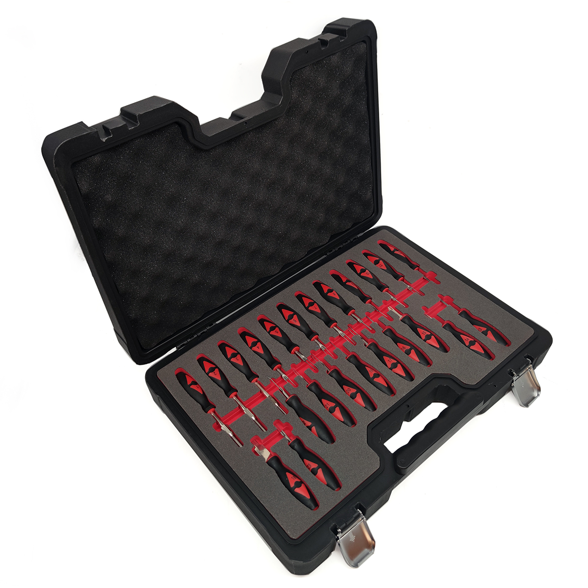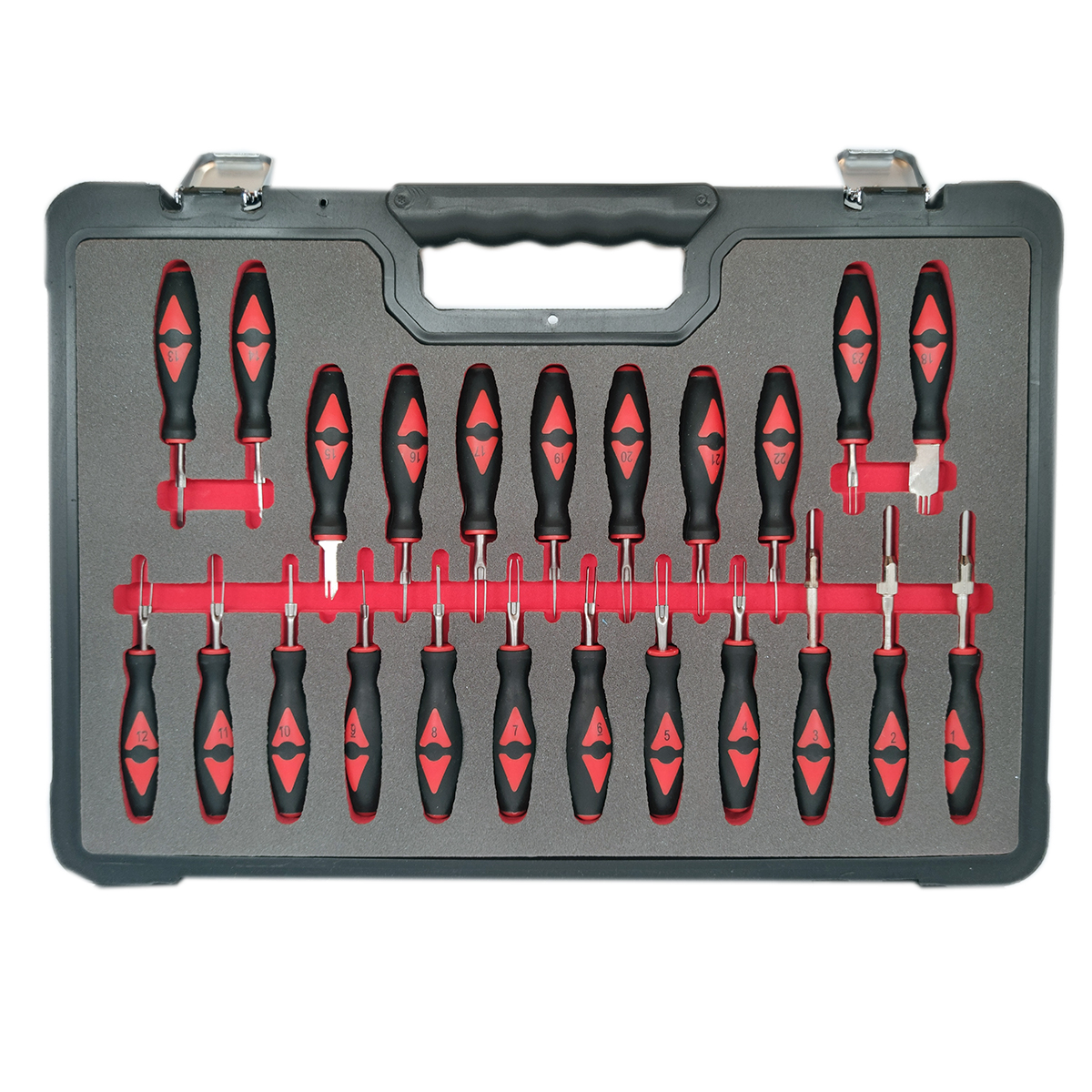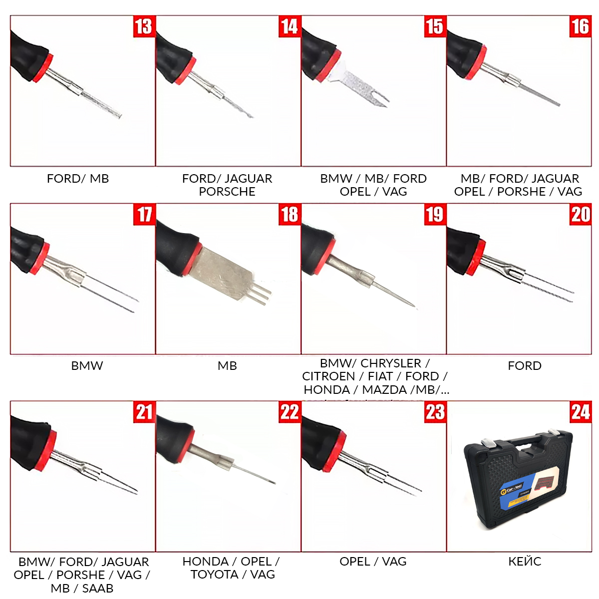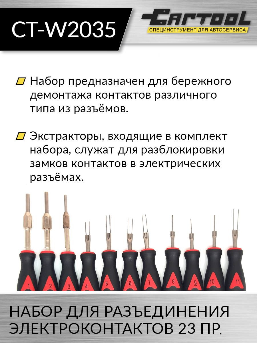 Набор для разъединения электроконтактов, 23 предмета, предназначен для бережного демонтажа контактов (плоских, круглых и др.) из разъёмов. Экстракторы, входящие в комплект набора, служат для разблокировки замков контактов в электрических разъёмах. Набор позволяет проводить работы практически со всеми разъёмами, используемыми на легковых, грузовых автомобилях и автобусах. Может применяться в автосервисе в качестве профессионального гаражного инструмента.