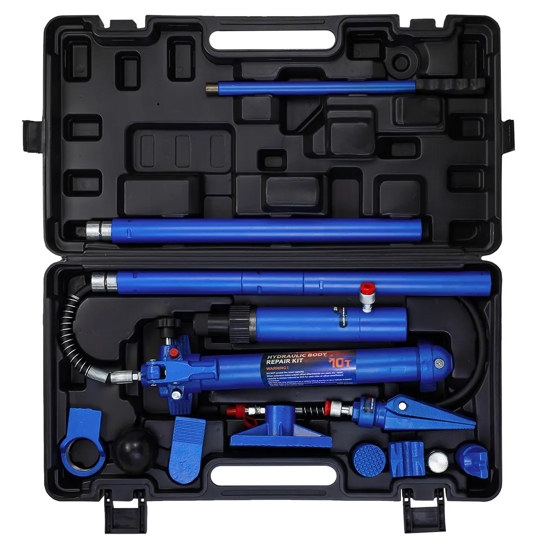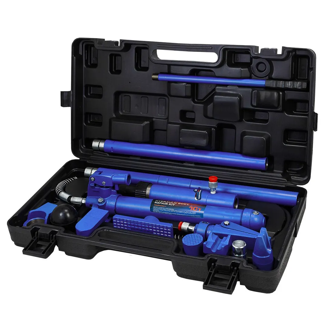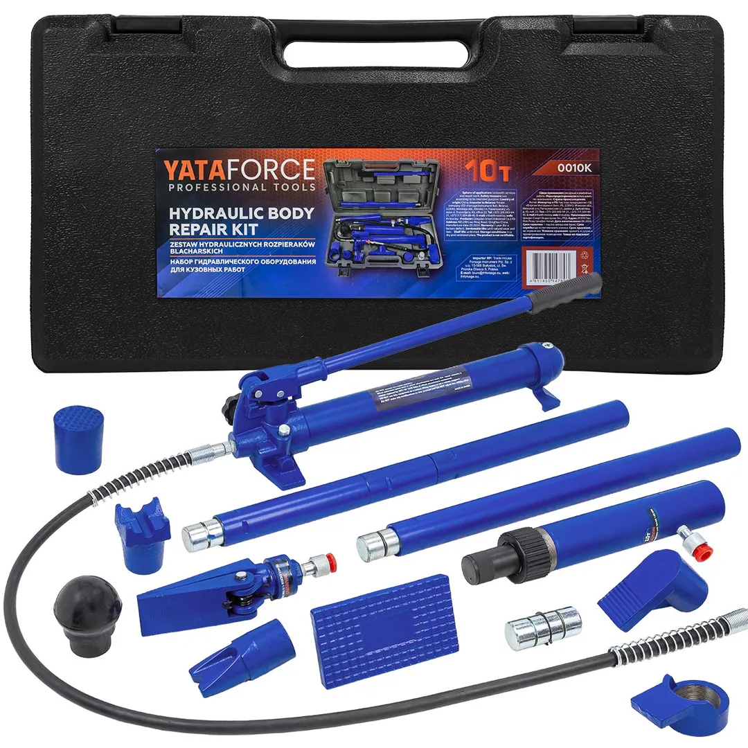 Набор гидравлического оборудования для кузовных работ предназначен для восстановления геометрии кузова и представляет собой компактный комплект из следующих состовляющих: Гидронасос, Гидрошланг, Гидроцилиндр, Удлинитель 4 шт., Насадка распорная клиновая, Плоский упор, Насадка фигурная клинообразная, Насадка зубчатая, V-образный упор 90°, Коннектор с наружной резьбой, Насадка резиновая, Упор цилиндра, Упор плунжера, Пластиковый кейс.