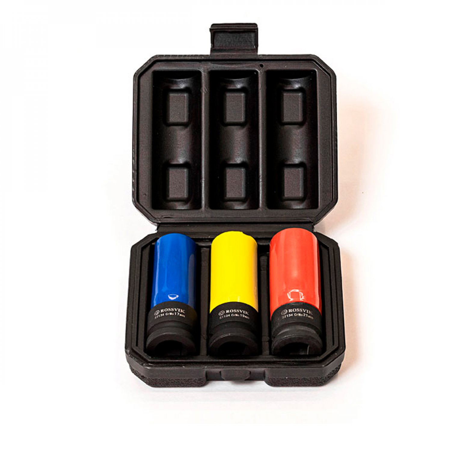 Набор головок ударных глубоких тонкостенных ST134 (1/2", 17, 19, 21 мм) с цветной пластиковой втулкой применяется для демонтажа и монтажа гаек литых дисков автомобилей пневматическими и электрическими гайковертами. Изготавливается из материала особой прочности, что делает эксплуатационный срок более долгим и повышает устойчивость к значительным нагрузкам. Головки имеют защитные цветные пластиковые накладки, что минимизирует повреждение колесных дисков при ремонтных работах. Цвет защитной накладки указывает на ее размер, что позволяет оперативно выбрать необходимую головку.
