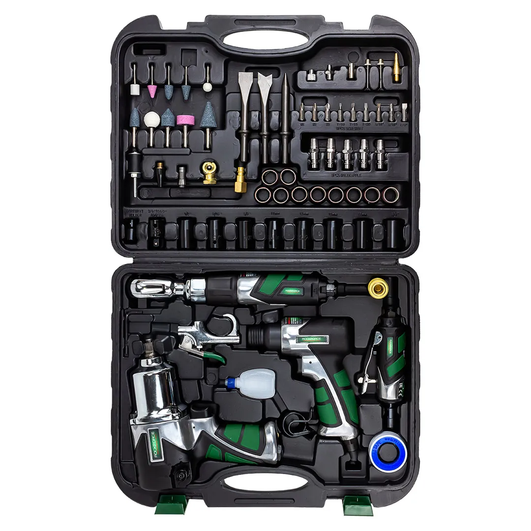 Набор пневмоинструмента с аксессуарами - это универсальный набор. в который входит все что нужно для выполнения различных работ. Набор пневмоинструмента предназначен для откручивания и закручивания болтов и гаек, винтов, шурупов, саморезов, зачистки поверхностей от коррозии, грязи и т.п., обдувки поверхностей от воды, пыли и других загрязнений. Профессиональные автомеханики и автолюбители, гараж которых оснащен достаточно мощным компрессором, смогут по достоинству оценить все преимущества набора пневматических инструментов и аксессуаров. Работающие на сжатом воздухе пневмоинструменты намного легче, безопаснее и удобнее, чем обычные электрические.