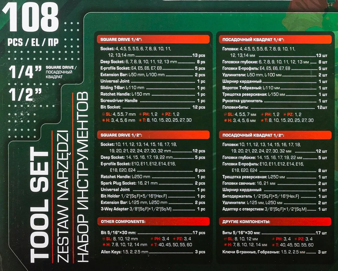 В наборе вы найдете широкий спектр инструментов, изготовленных из высококачественной хромованадиевой стали. Этот материал обеспечивает исключительную прочность, устойчивость к коррозии и длительный срок службы даже при интенсивной эксплуатации. Эргономичные рукоятки инструментов обеспечивают удобный захват и снижают утомляемость при длительной работе.