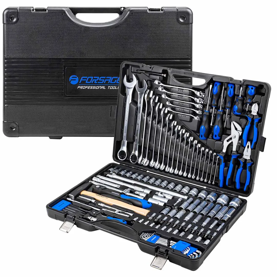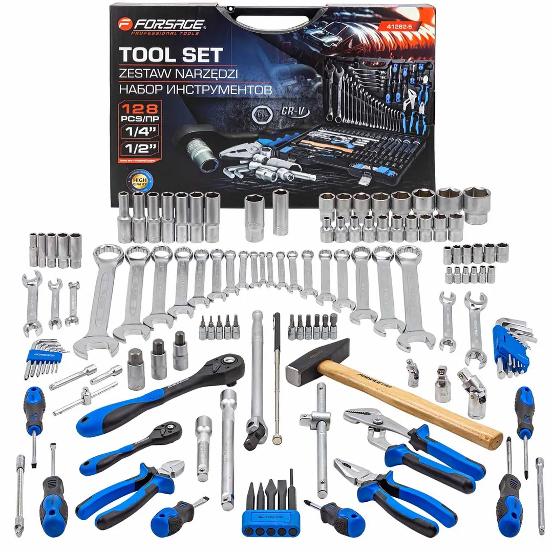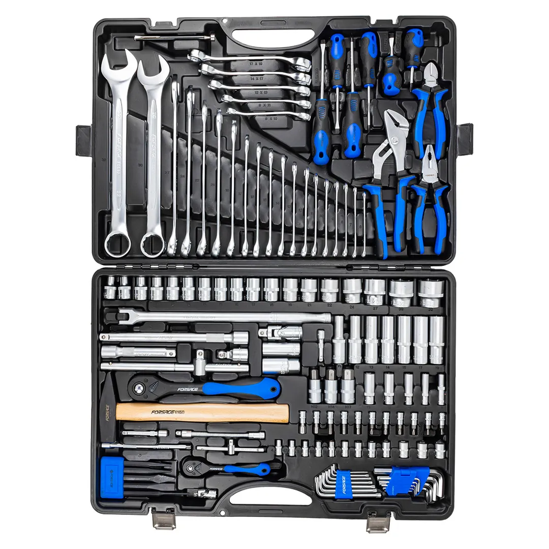 Набор инструментов состоит из 128 предметов в кейсе и включает в себя практически всё, что необходимо для большинства ремонтных работ - как в гараже обычного автолюбителя, так и в боксе специализированного сервиса. За счет высокого качества и прочности всех составляющих комплекта, для производства которого применяются особые марки высоколегированных сталей, данный набор инструментов сможет использовать в работе любой профессиональный мастер.