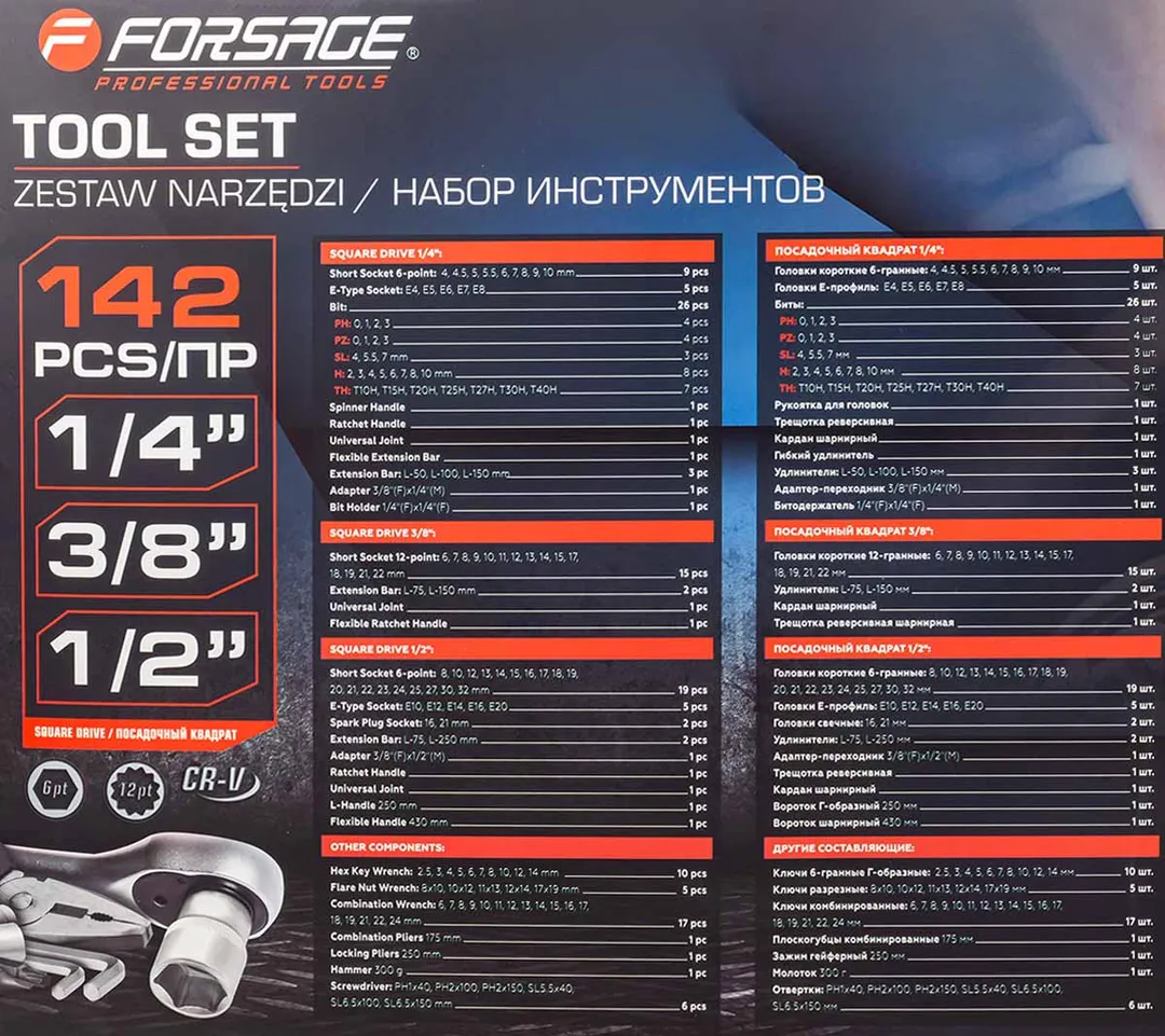Посадочный квадрат: 1/4", 3/8", 1/2".