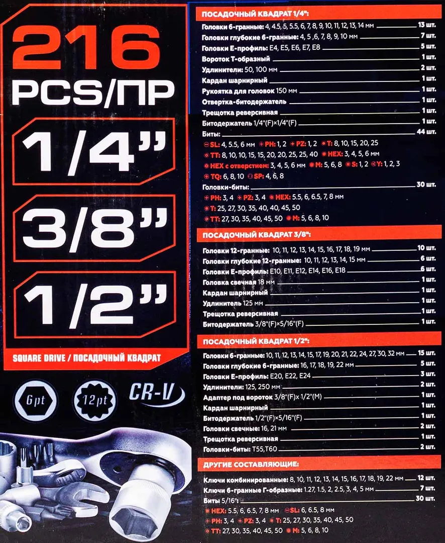 Посадочный квадрат: 1/4", 3/8", 1/2".