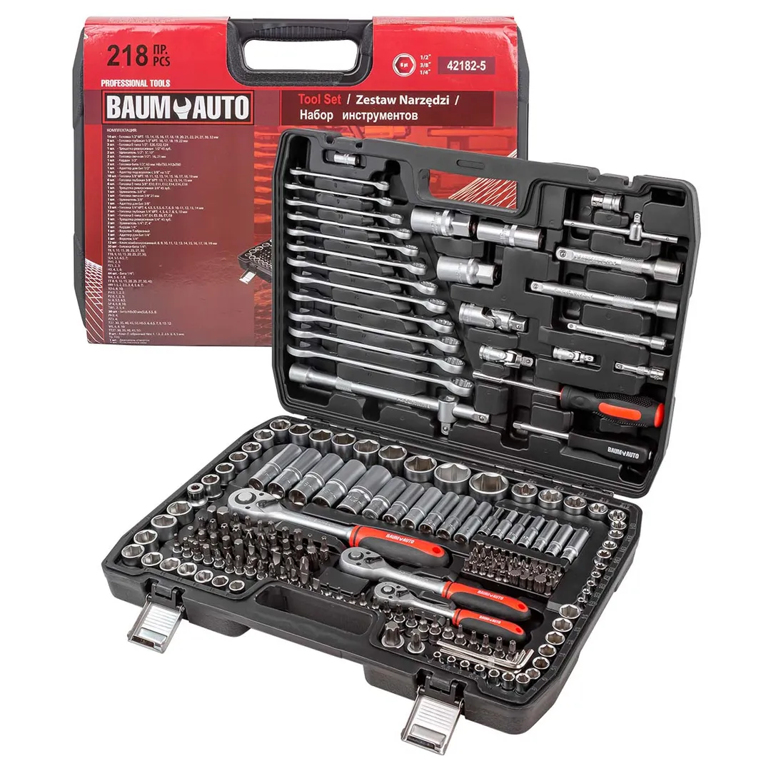 Посадочный квадрат: 1/4", 3/8", 1/2". Тип головок: 6-гранные, Е-профиль, короткие, глубокие. Комплектация: головки 1/4"короткие 25 мм: 4, 4.5, 5, 5.5, 6, 7, 8, 9, 10, 11, 12, 13, 14 мм; головки 1/4"глубокие 50 мм: 4, 5, 6, 7, 8, 9, 10 мм; головки 1/4"Е-профиль 25 мм: Е4, Е5, Е6, Е7, Е8; биты 1/4"HEX 25 мм: 1.5, 2, 2.5, 3, 4, 5, 6, 7 мм; биты 1/4"TORX 25 мм: T8Н, Т9Н, T10Н, T15Н, T20Н, T25Н, Т27Н, Т30Н, Т40Н; биты 1/4"SL 25 мм: 4, 5.5, 6.5мм; биты 1/4"РН 25 мм РН.0, РН.1, РН.2, РН.3; биты 1/4"PZ.0, PZ.1, PZ.2, PZ.3; биты 1/4"Spanner 25 мм: 4, 6, 8, 10 мм; биты 1/4"Tri wing 25 мм: 1, 2, 3, 4; биты 1/4"Torq set 25 мм: 6, 8, 10; биты 1/4"Spline 25 мм: М4, M5, M6, M8; головки-биты 1/4"HEX 35 мм: 3, 4, 5, 6 мм; головки-биты 1/4"TORX 35 мм: T8, Т9, T10, T15, T20, T25, Т27, T30, T8Н, Т9Н, T10Н, T15Н, T20Н, T25Н, Т27Н, T30Н; головки-биты 1/4"SL 35 мм: 4, 5.5, 6.5, 7 мм; головки-биты 1/4"РН 35 мм: РН.1, РН.2, РН.3; головки-биты 1/4"PZ 35 мм: PZ.1, PZ.2, PZ.3; трещотка 1/4"на 45 зубов; вороток 1/4"Т-образный 115 мм; удл