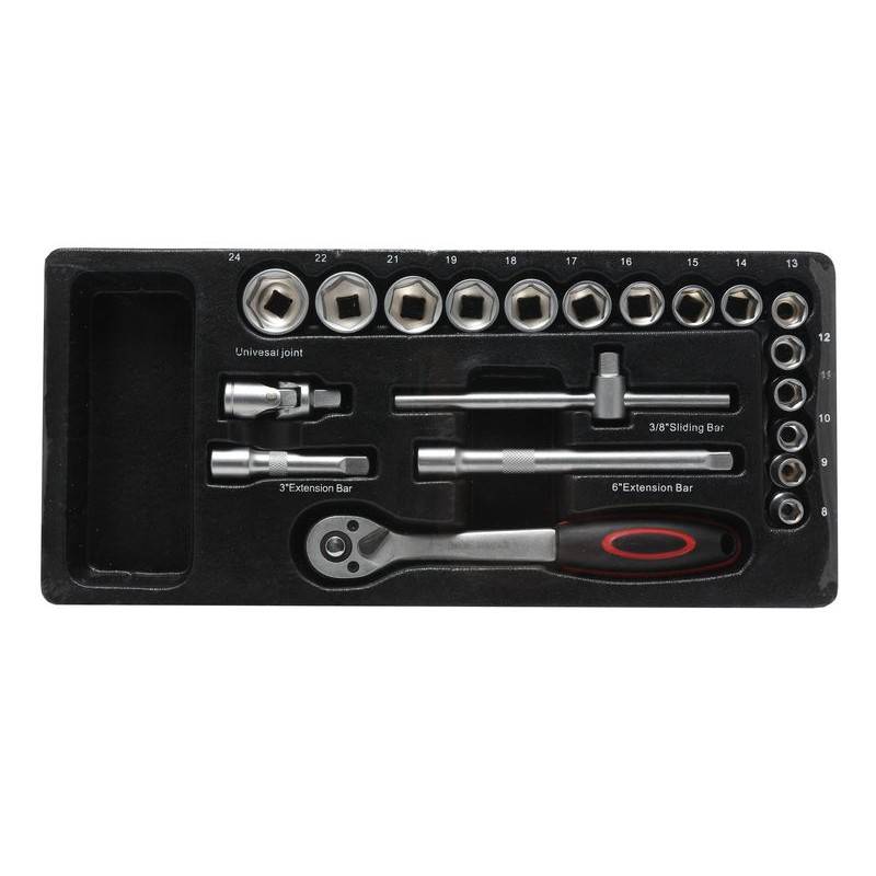 "Торцевые головки 3/8"": 15 предметов 8-24мм Трещотка 3/8""72 зуб. Т-образный вороток 3/8""150мм Кардан шарнирный Удлинители 3/8"": 2 предмета 75-150мм"
