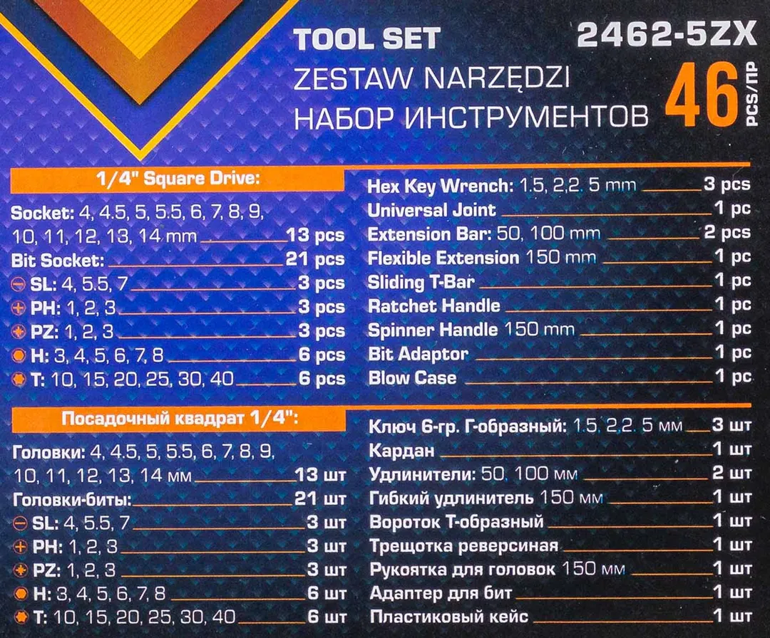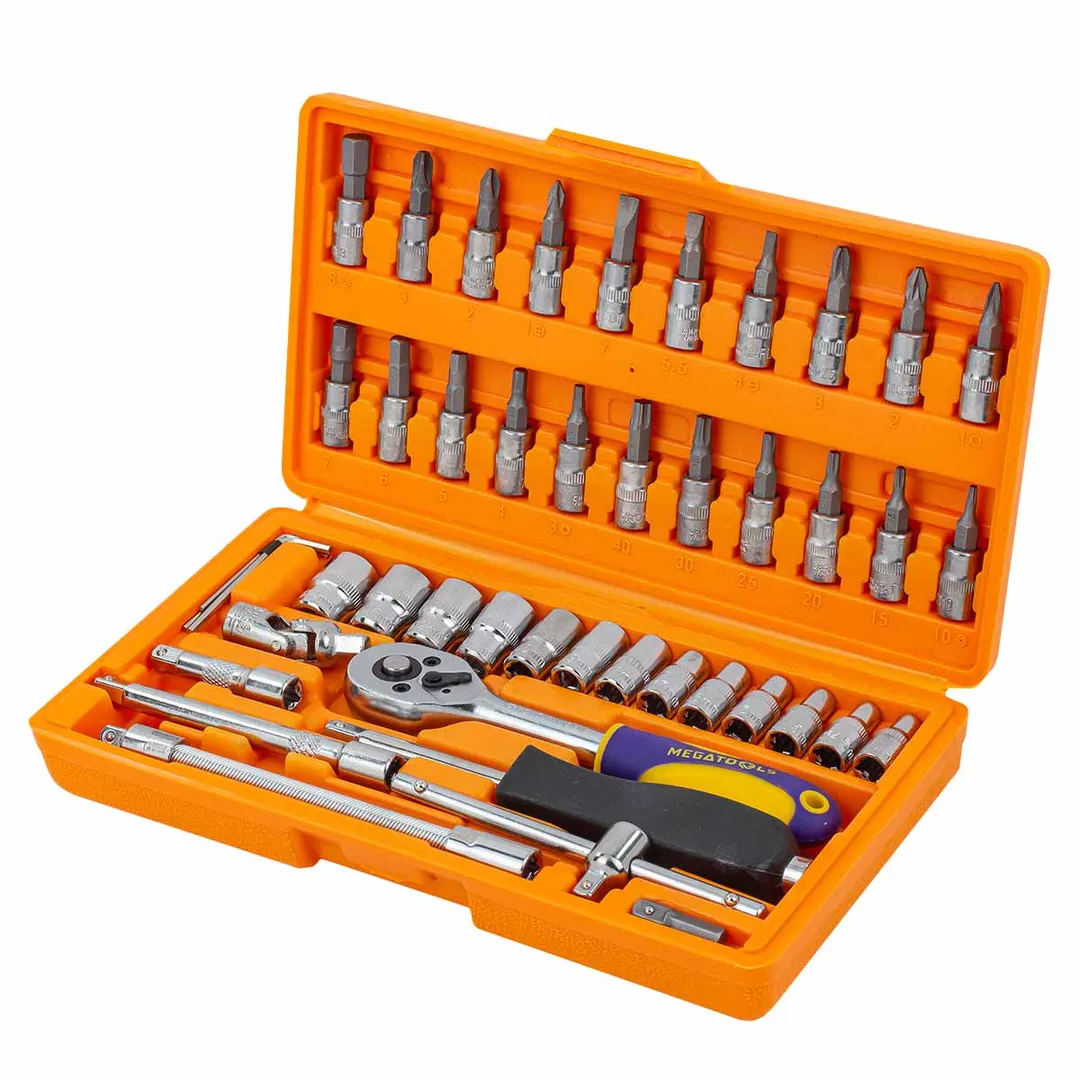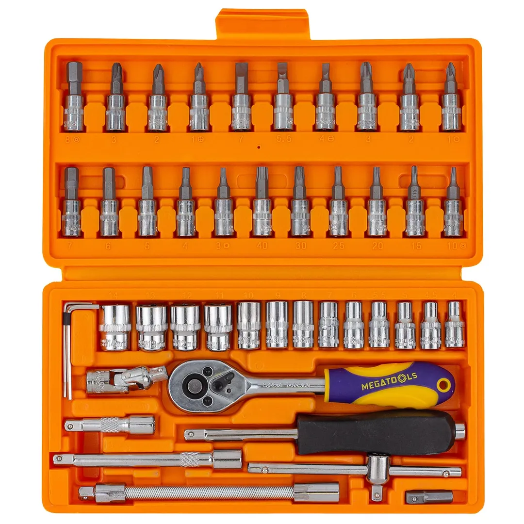 Набор инструментов из 46 предметов для слесарных, монтажных, ремонтных работ. Набор имеет ряд достоинств, позволяющих значительно облегчить выполнение работ при обслуживании и ремонте. Для удобства работы в кейсе помечены размеры головок. Инструменты изготовлены из хромованадиевой стали, которая устойчива к коррозии.