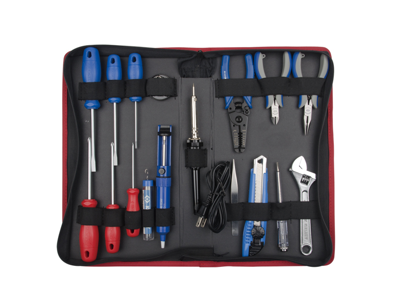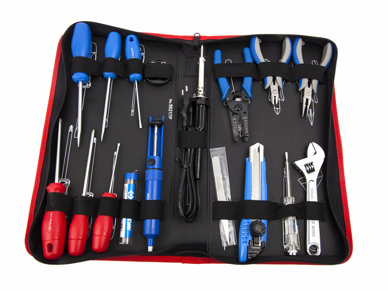 тип инструмента / наименование серия / артикул размер / количество Отвертка крестовая Phillips 1411 PH0x75, PH1x100, PH2x100 Отвертка шлицевая Slotted 1412 3x75, 5.5x100, 6.5x100 Припой в пластиковой колбе 6BF11-17 свинец 40%, олово 60%, Ø1 мм Оловоотсос, приспособление для удаления припоя 6BD11 195 мм Паяльник, пластмассовая ручка 6BC23A 30 Вт, 220 В Пассатижи для зачистки изоляции и резки проводов 6741-06 160 мм Бокорезы 6207-05 118 мм Круглогубцы с полукруглым сечением губок и режущей кромкой 6377-55 138 мм Пинцет прецизионный 6AF11-125 125 мм Нож со сменными лезвиями 7976-65 лезвие 18 мм Пробник 6CB02 100-250 В Ключ разводной 3611-06R 150 мм