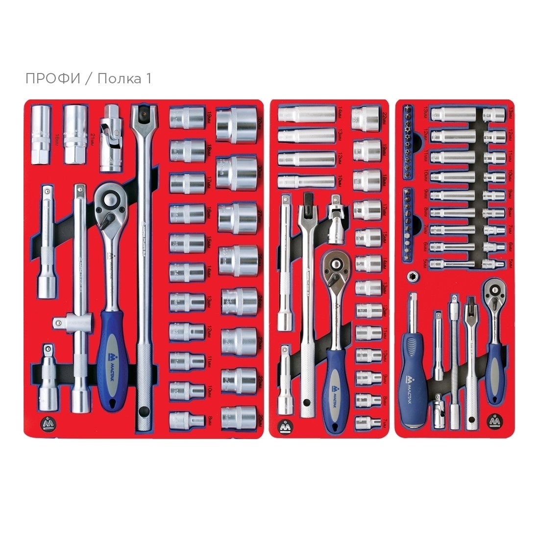 8, 10, 11, 12, 13, 14, 15, 16, 17, 18, 19, 20, 22, 23, 24, 26, 27, 30, 32 мм Свечные 6-гранные 16, 21 мм (резиновый фиксатор) Трещотка флажковая с кнопкой 45 зубцов, 250 мм Вороток с шарниром 375 мм Удлинители 125, 250 мм Удлинитель с шаровым окончанием 75 мм Кардан 78 мм Переходник с отверстием для удлинителя 3/8">1/2"