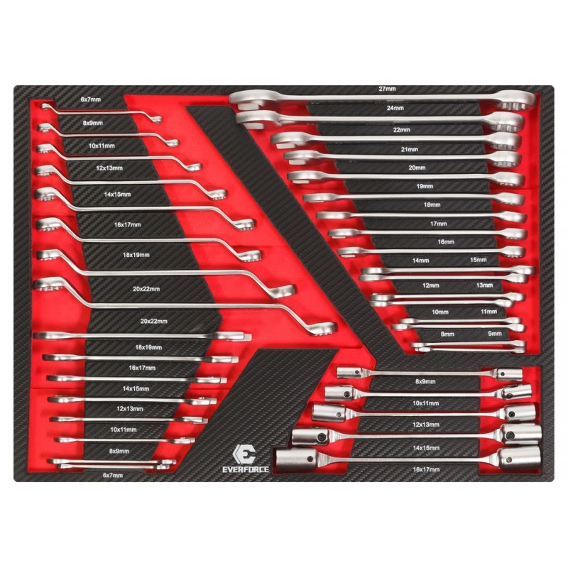 38 предметов (торцовые шарнирные: 8-17мм, рожковые: 6-22мм, накидные: 6-22мм, комбинированные: 8-27мм), в ложементе.