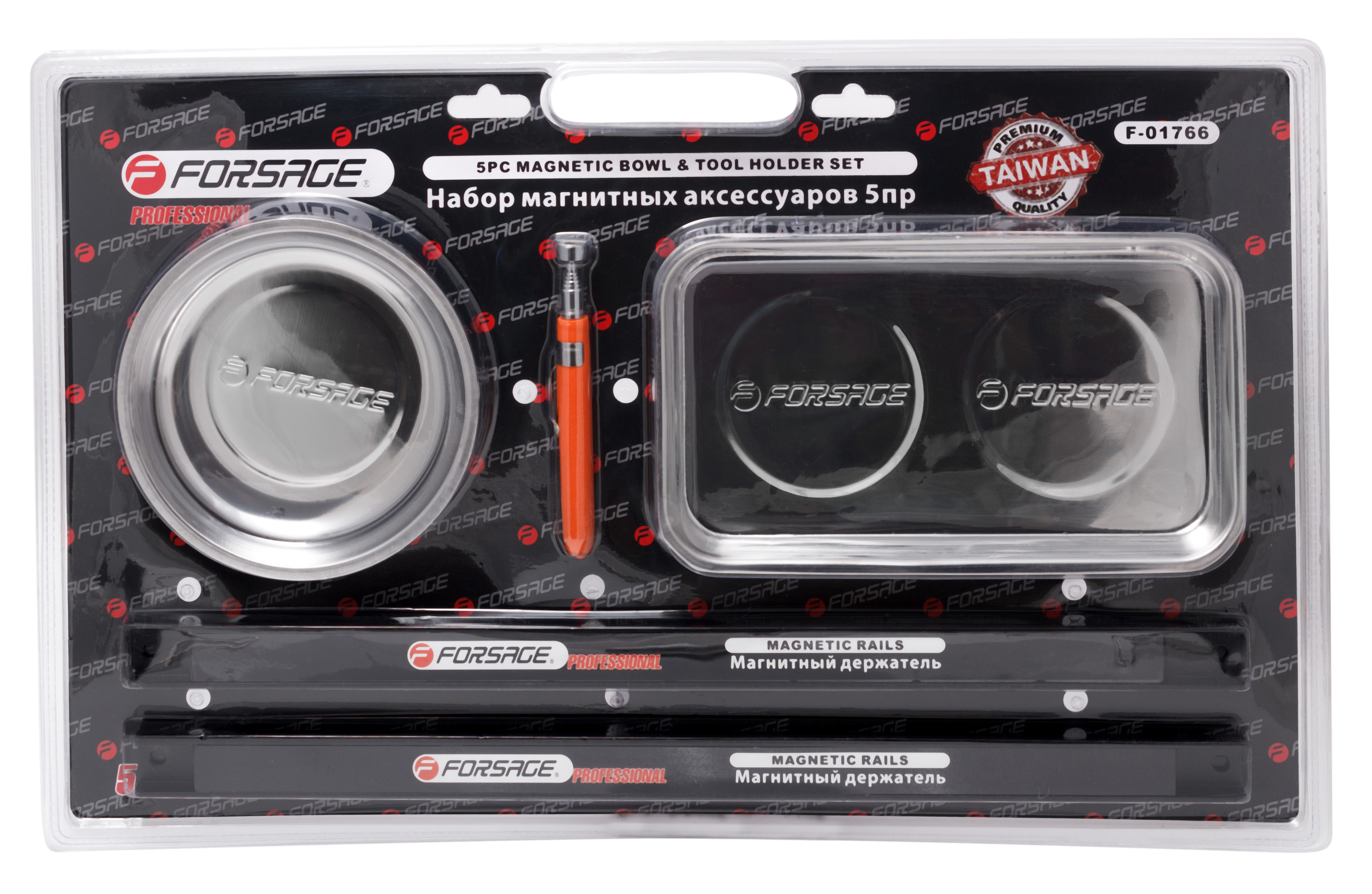 Набор магнитных аксессуаров (планка - 460мм х 2шт, лоток - 240х140мм, лоток - диаметр 150мм, магнит телескопический ) 5пр., в блистере Forsage F-01766
