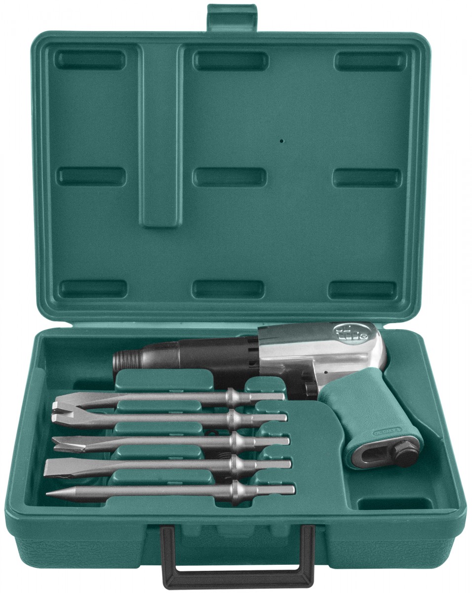 Набор молоток пневматический 2100 уд/мин., патрон H10, с насадками, 8 предметов. Набор, содержащий, помимо собственно пневматического молотка JAH-6833H, пять наиболее распространенных насадок для производства работ по резке, рубке, разрушению и т.п. металов и материалов различной твердости и пластичности. При проведении работ с использованием этого инструмента необходимо защищать руки, с помощью перчаток, гасящих вибрацию, применять средства защиты органов зрения, дыхания и слуха.