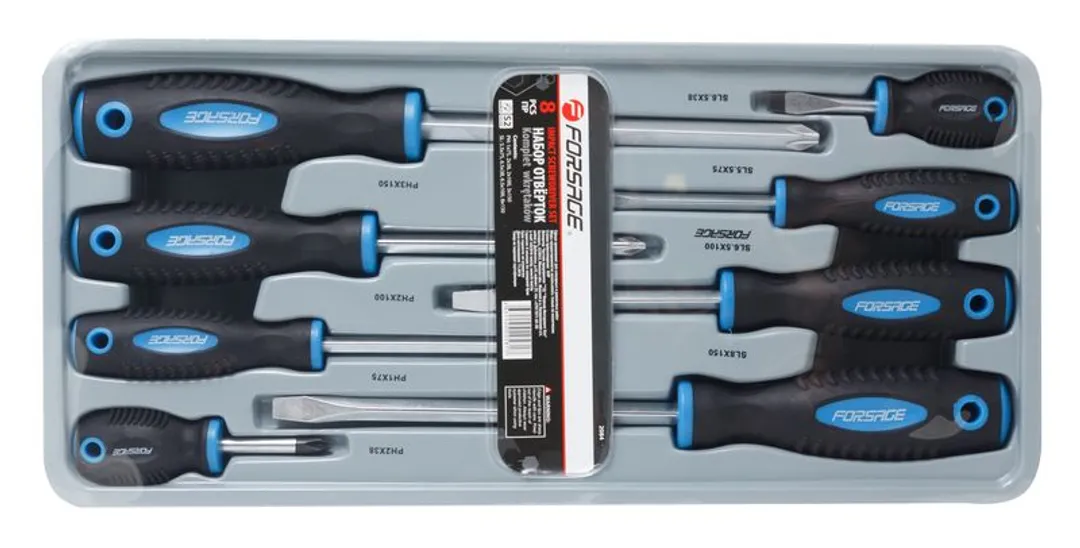 Набор отверток силовых "Profi" с магнитными наконечниками 8 предметов в пластиковом ложементе - это удобный и надежный инструмент для работы с крепежными элементами. В набор входят восемь отверток разной длины и диаметра рабочей части: PH1х75мм, РН2х38мм, PH2х100мм, PH3х150мм; SL5.5x75мм, SL6.5х38мм, SL6.5х100мм, SL8х180мм. Отвертки имеют магнитные наконечники, которые позволяют легко захватывать и удерживать крепежные элементы, что делает работу более быстрой и удобной. Набор отверток предназначен для использования профессионалами, поэтому все инструменты изготовлены из высококачественной стали S2, которая обеспечивает высокую прочность и долговечность. В набор входят отвертки разных размеров, что позволяет выбрать оптимальный размер для каждой конкретной задачи. Рукоятка каждой отвертки имеет эргономичную форму, что обеспечивает удобство при работе и снижает риск повреждения рук. В основании каждой рукоятки предусмотрено сквозное отверстие, которое позволяет подвешивать инструмент на гвоздь или крючок. Благ