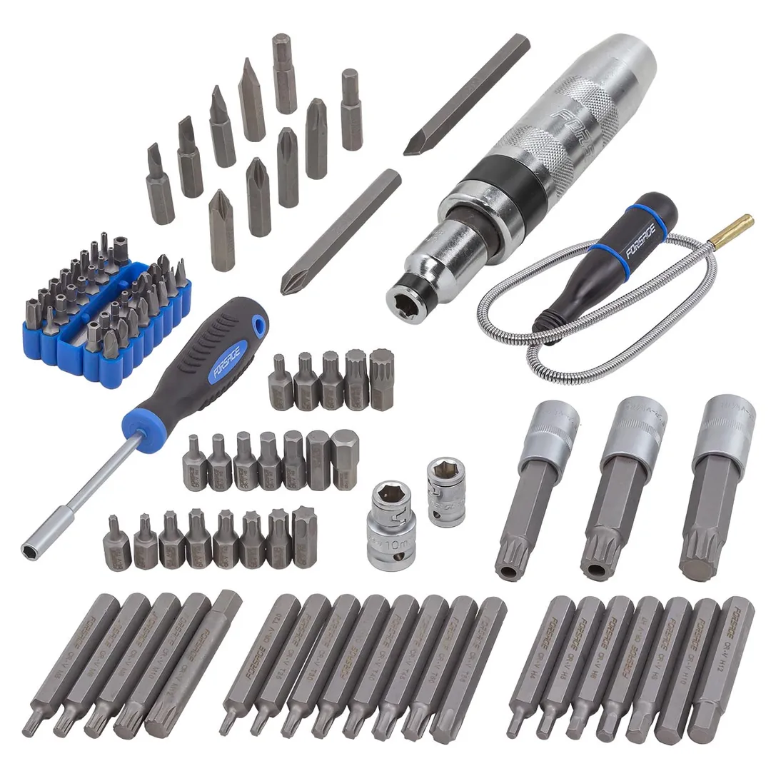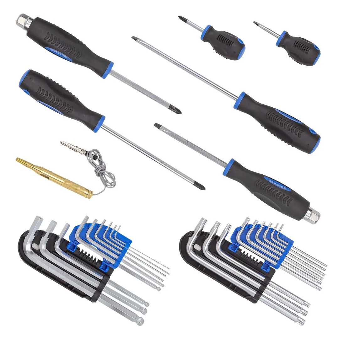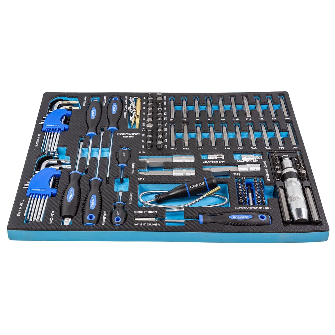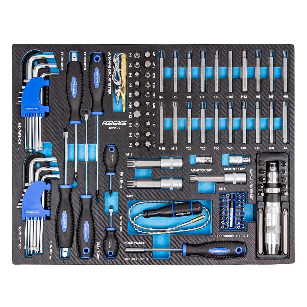 Ключи 6-гранные Г-образные с окр. наконечником: 1,5-2-2,5-3-4-5-6-8-10 мм; Ключи Г-образные TORX: Т10, Т15, Т20, T25, T27, T30, T40, T45, T50; Отвертки шлицевые магнитные: SL5x38, SL6x100, SL6x150; Отвертки крестовые магнитные: PH1x38, PH0x75, PH2x100, PH2x150; Отвёртка-битодержатель 1/4" 215мм; Гибкий магнит 500мм; Отвёртка индикаторная; Биты 30мм (посадочный размер 10мм): Н4, Н5, Н6, Н7, Н8, Н10, Н12, М5, М6, М8, М10, М12, Т20, T25, T30, T40 (2 шт.), T45, T50, Т55; Биты 75мм (посадочный размер 10мм): Н4, Н5, Н6, Н7, Н8, Н10, Н12, М5, М6, М8, М10, М12, Т20, T25, T30, T40 (2 шт.), T45, T50, Т55; Головки-биты 1/2" 100мм: М14, М16, М18; Битодержатель 1/2"; Битодержатель 3/8”; Отвёртка ударная с адаптером-битодержателем 1/2"(F)-5/16”(F); Биты 5/16”: SL8x80, SL5x36, SL6x36, SL7x36, SL8x36, PH2x80, PH1x36, PH2x36, PH3x36, PH4x36, H6x36, H7x36; Биты 1/4” трехлучевая: 6-8-10мм; Биты 1/4” TORG: 1-2-3-4мм; Биты 1/4” SPANNER: 4-6-8-10 мм; Биты 1/4” TORX с отверстием: Т8, Т10, Т15, Т20, T25, T27, T30, Т35,