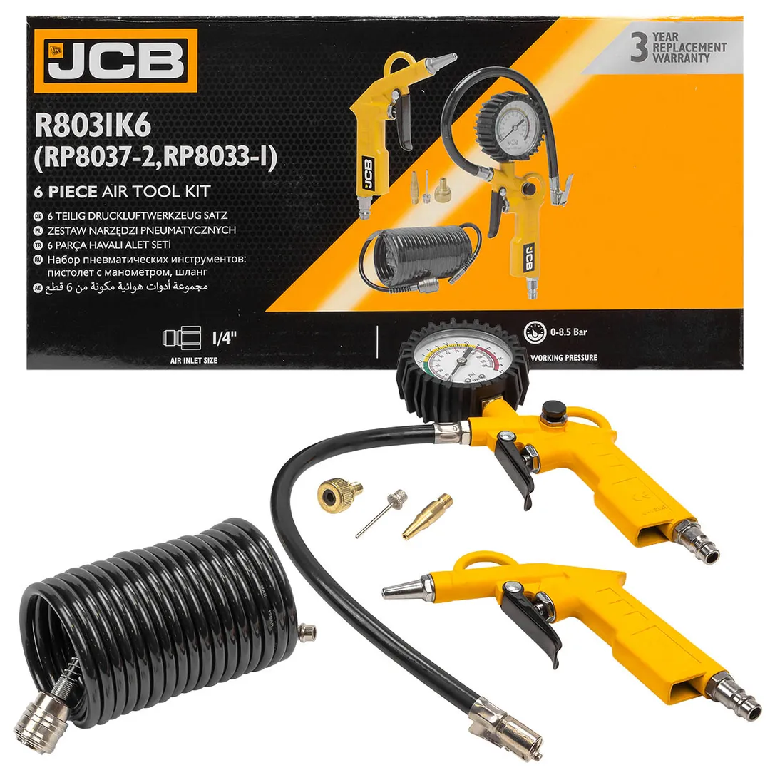 Комплектация: 1шт. пистолет для подкачки шин с манометром и 3шт. адаптера, рабочее давление 0-8.5 бар, длина шланга 350мм; 1шт. пистолет продувочный, диаметр сопла 2мм; 1шт. шланг витой полиуретановый с быстросьемами, внешний диаметр 8мм, внутренний диаметр 5мм, длина 5м.