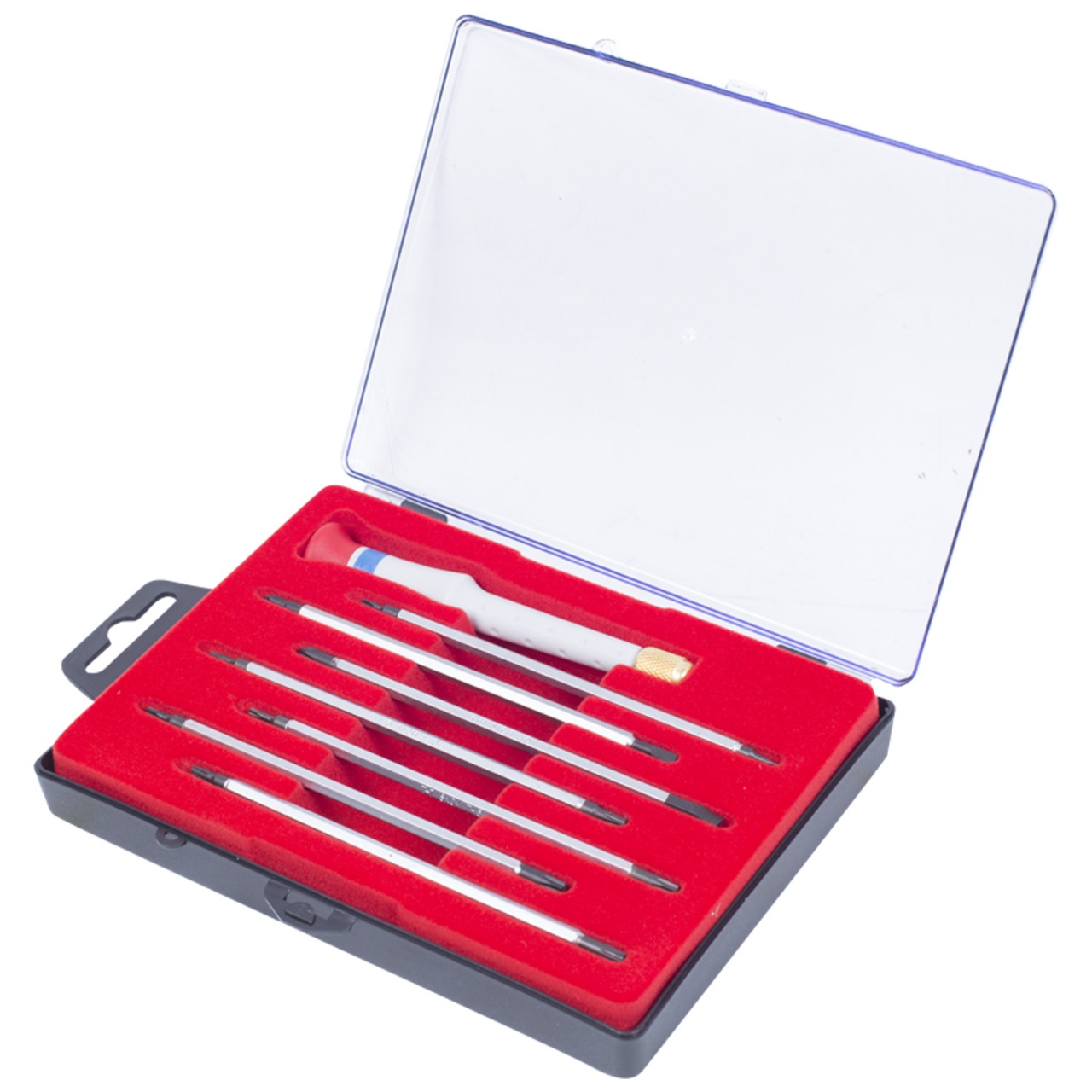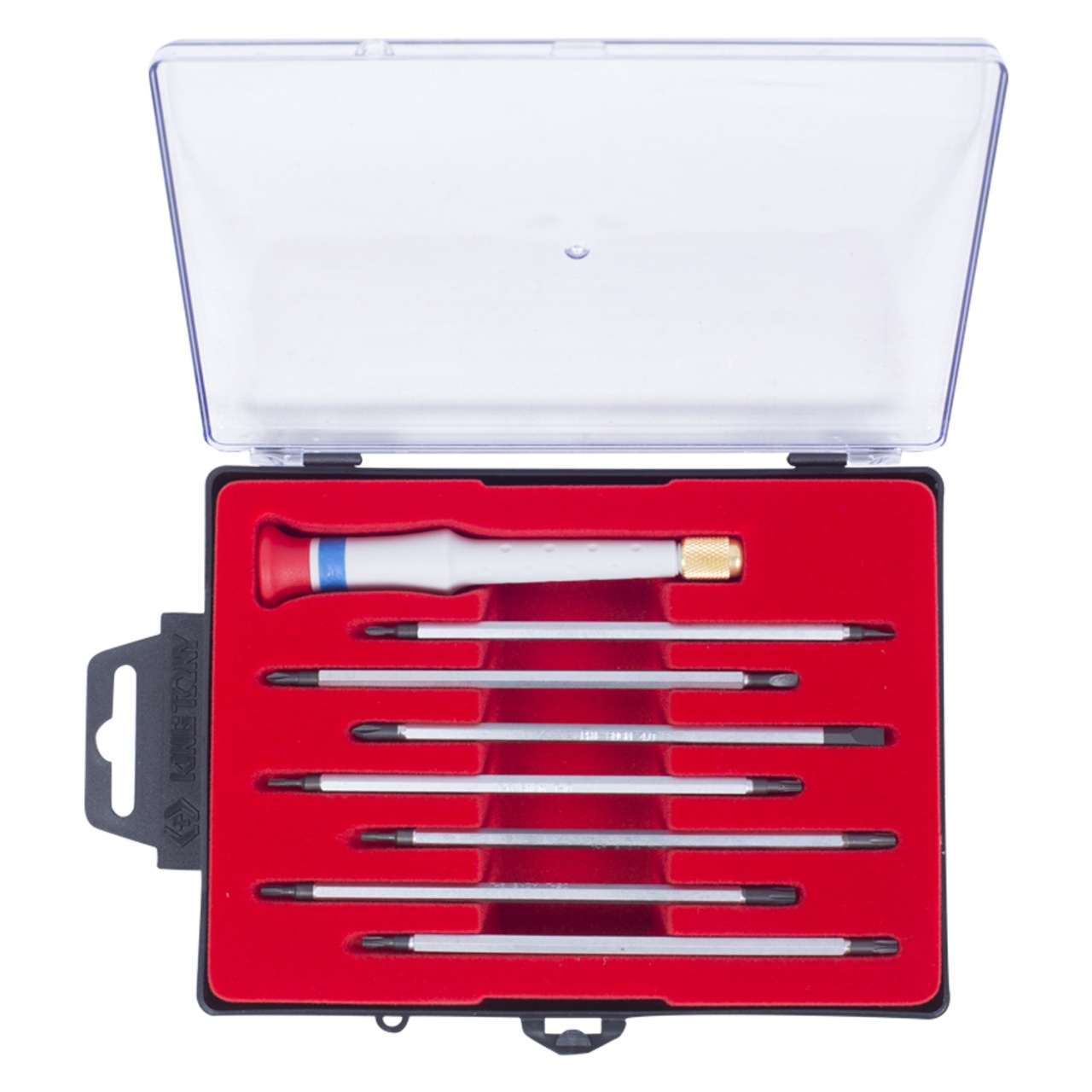 Набор прецизионная отвертка с насадками 8шт KING TONY 32607MR включает в себя эргономичную отверточную рукоятку, которая имеет возможность замены стержней. В наборе представлено 7 двусторонних стержней с разнообразными профилями наконечников для выполнения мелких крепежных работ. Такой набор станет прекрасным помощником для работы в сфере точной механики. Для удобства хранения и транспортировки приспособлений предусмотрен футляр с отдельными ложементами для каждого компонента.