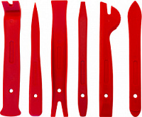 Набор приспособлений для демонтажа декоративных панелей салона автомобиля из 6 предметов. Инструменты, входящие в состав набора, применяются для демонтажа внутренних декоративных панелей салона автомобиля. Особая форма съемников предназначена для снятия панелей без повреждений. Специальный материал.