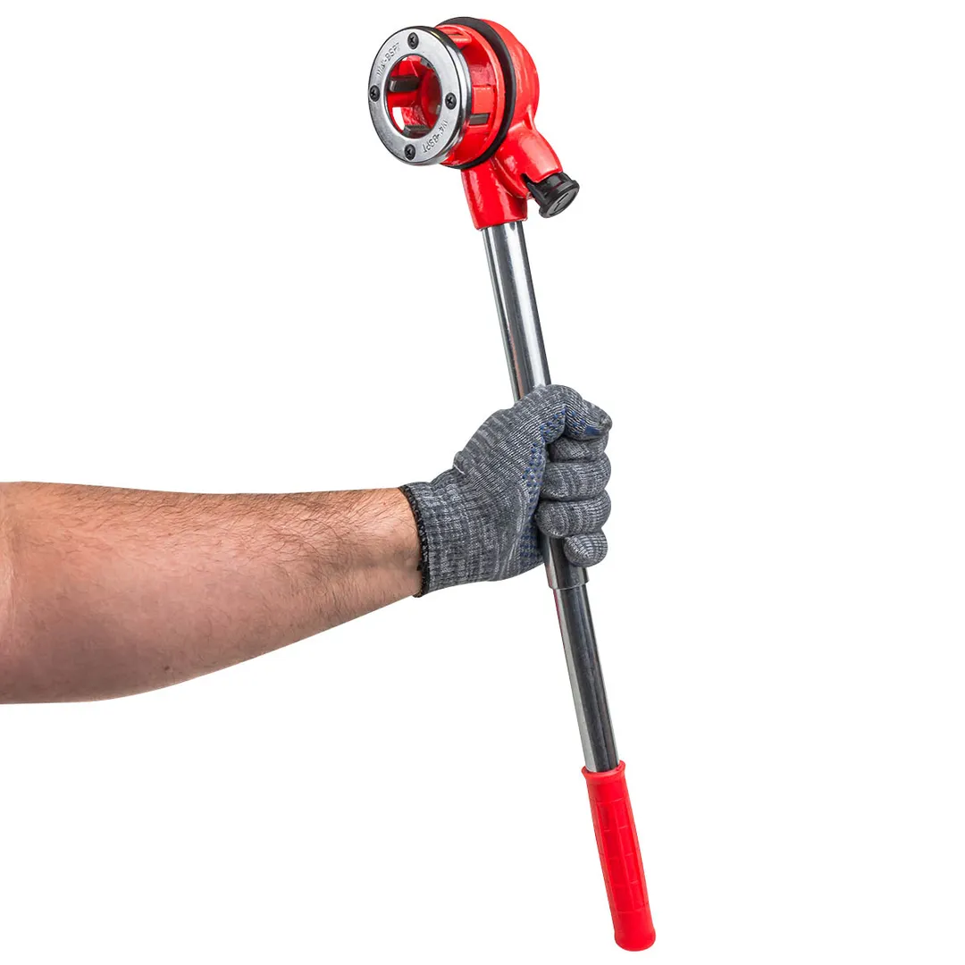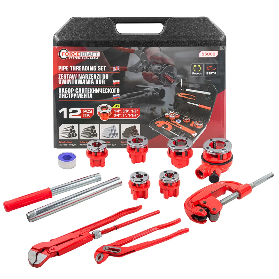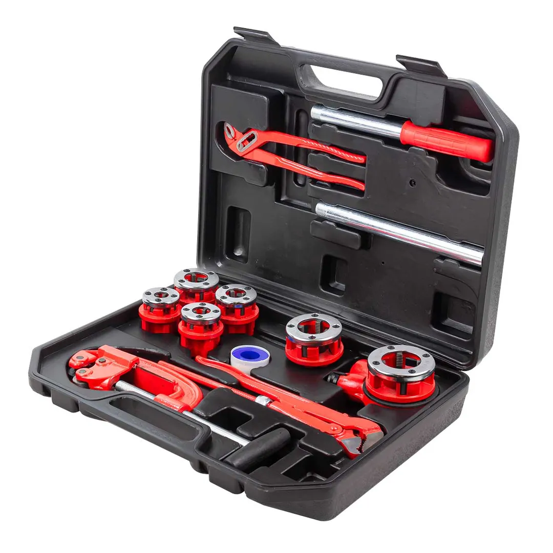 Комплектация: плашкодержатель с трещоткой/клупп, сменные плашки (1/4'', 3/8'', 1/2'', 3/4'', 1'', 1- 1/4''), труборез для стальных труб, клещи, газовый ключ, ФУМ лента, удлинитель, кейс.