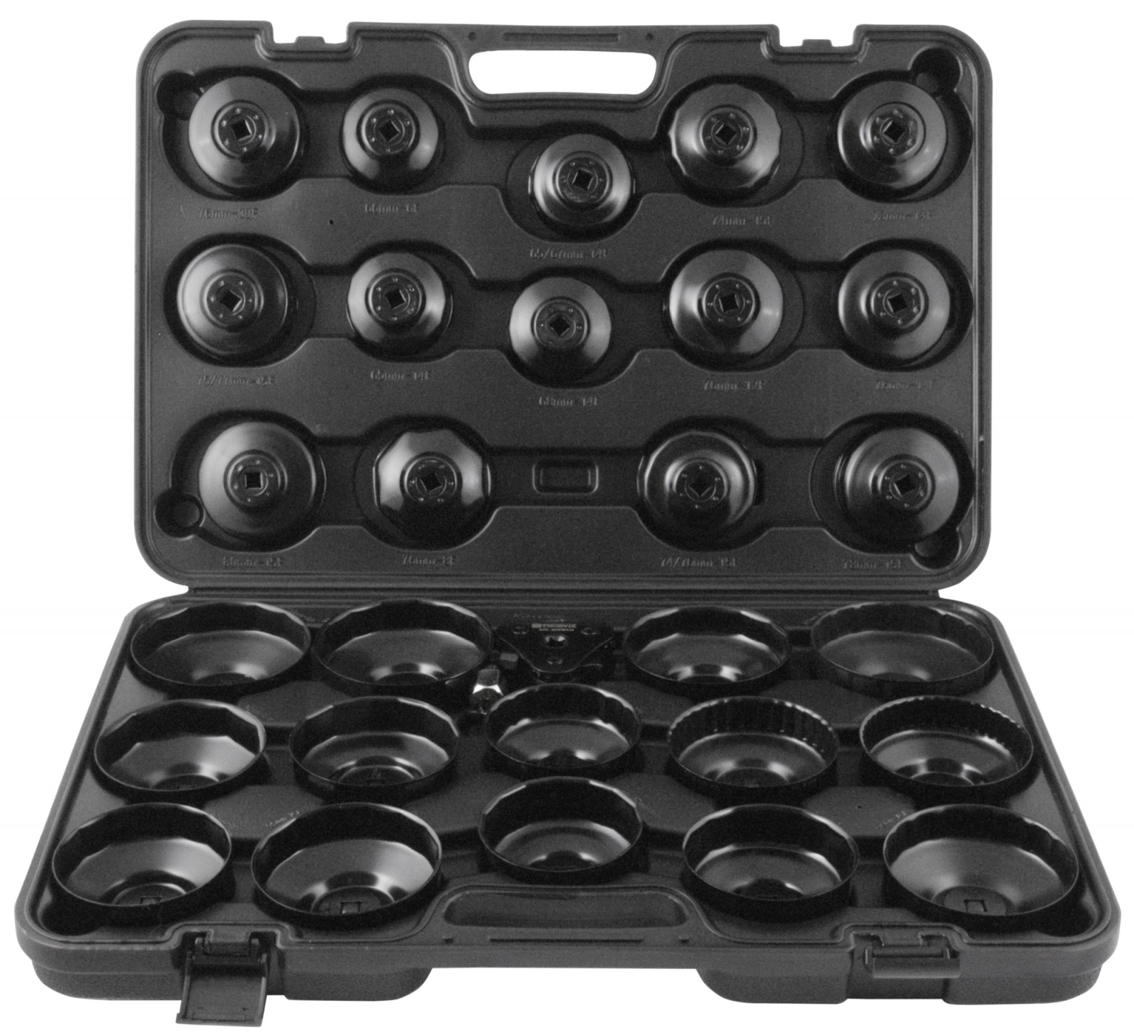 Комплект чашек для демонтажа масляных фильтров 65-108 мм, 30 предметов. Все съемники изготовлены из штампованной стали и снабжены присоединительным гнездом, позволяющим использовать приводы с размером квадрата 3/8”DR или в сочетании с входящим в комплект поставки переходником 1/2"DR(F)х3/8"(М).
