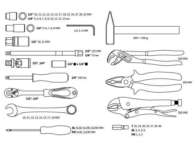 Назначение: многофункциональный набор предназначен для ремонта и обслуживания автомобиля, а также для выполнения других слесарных работ,