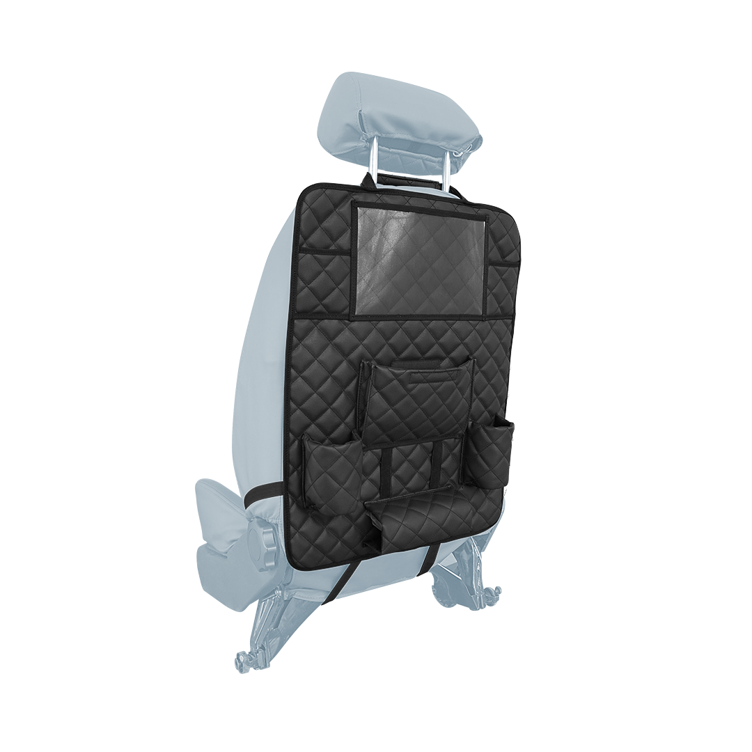 Универсальная защитная накидка на переднее сиденье. Накидка оснащена карманами и отсеками для хранения, имеется отсек для планшета или телефона. Выполнена из высококачественной экокожи. Защитит заднюю поверхность сиденья от следов детских ног, шерсти животных и других видов грязи. Благодаря плотности материала накидка хорошо держит форму и не закручивается по краям, обеспечивая плотное и ровное прилегание по всей поверхности спинки сиденья.