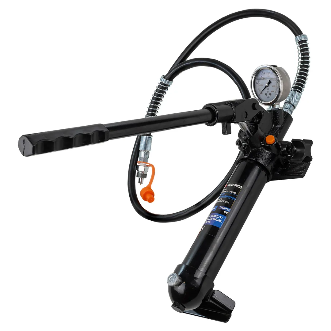 Ручной гидравлический насос применяется для работ с гидравлическими цилиндрами прямого и обратного действия в гидравлических гаражных прессах и кранах, стяжках пружин подвески автомобилей, наборах гидравлических растяжек для кузовного ремонта. Длинная рукоятка с эргономичным обрезиненным местом хвата. Соединение шланга закрыто защитным колпаком, надежный спускной винт из металла. В комплект входит только сам насос и шланг 1,3 м.