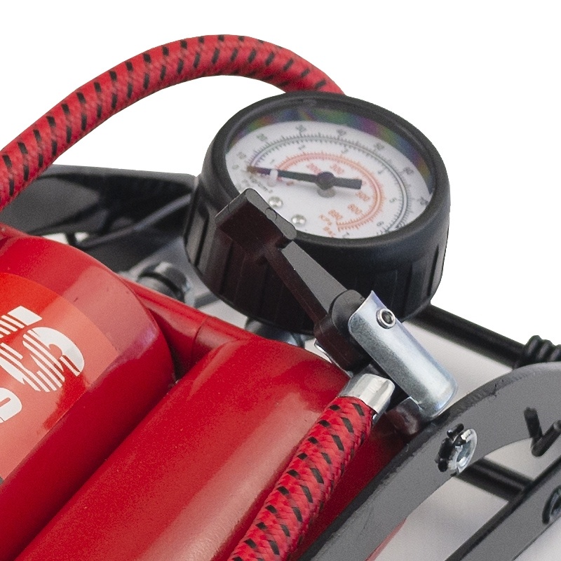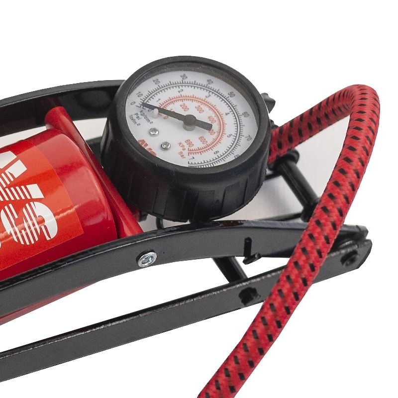 Насос состоит из опорной рамы, педали, поршня со штоком, 2-х цилиндров, возвратной пружины, манометра со шлангом и невозвратным клапаном.
