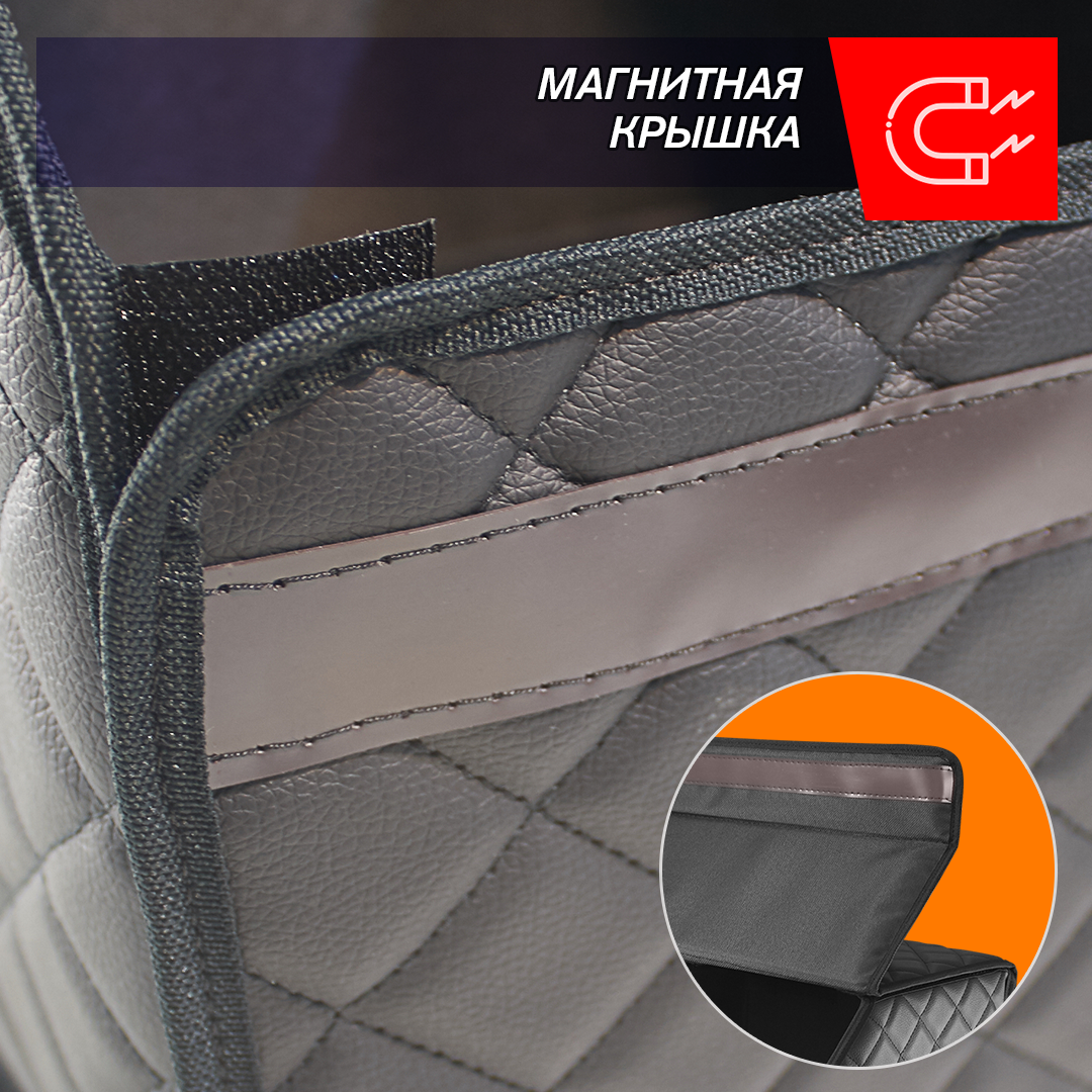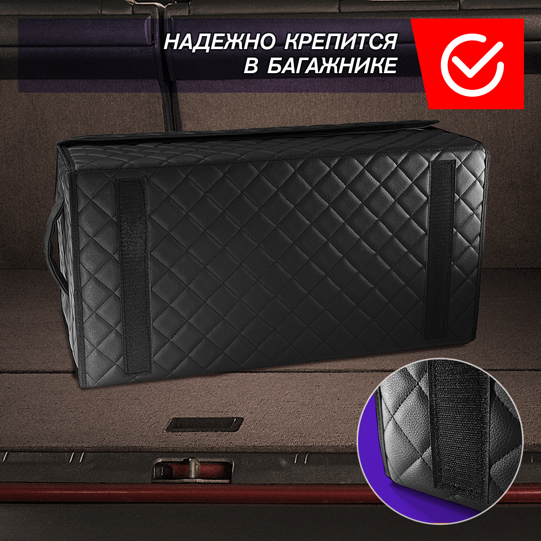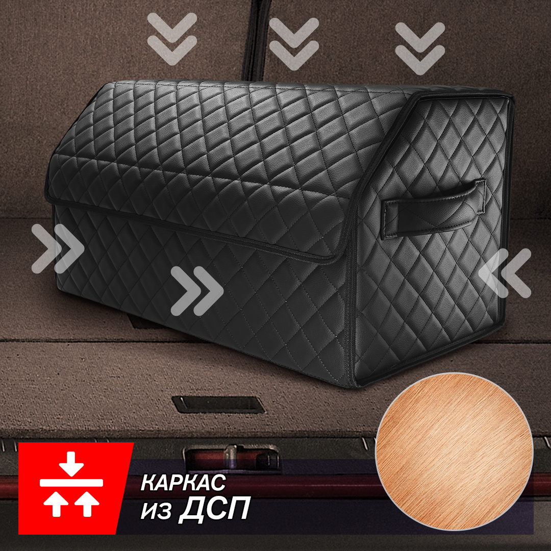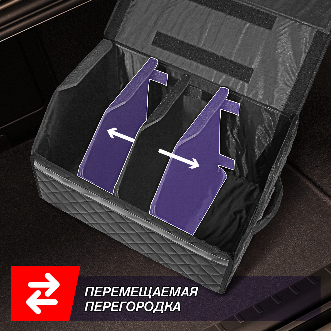 Автокейс в машину спасет ваш багажник от бесконечного беспорядка! Автомобильный универсальный органайзер для хранения всех необходимых аксессуаров и быстро находить их. Кофр изготовлен из износостойкой автомобильной экокожи. Крышка надежно фиксируется магнитной лентой. Имеет прочный корпус из ДВП. На дно нашита антискользящая лента для предотвращения перемещения кейса при поворотах и торможении. На боковых стенках расположены ручки из экокожи для удобного перемещения. Внутренняя отделка изготовлена из водонепроницаемой ткани, даже если внутри прольется масло, оно не испачкает багажник. В комплекте имеется одна перемещаемая перегородка для разделения пространства на нужные вам по размеру отсеки. Автокейс имеет разборную конструкцию для удобного и компактного складского хранения, ведь в разобранном виде автокейс в высоту всего несколько сантиметров.