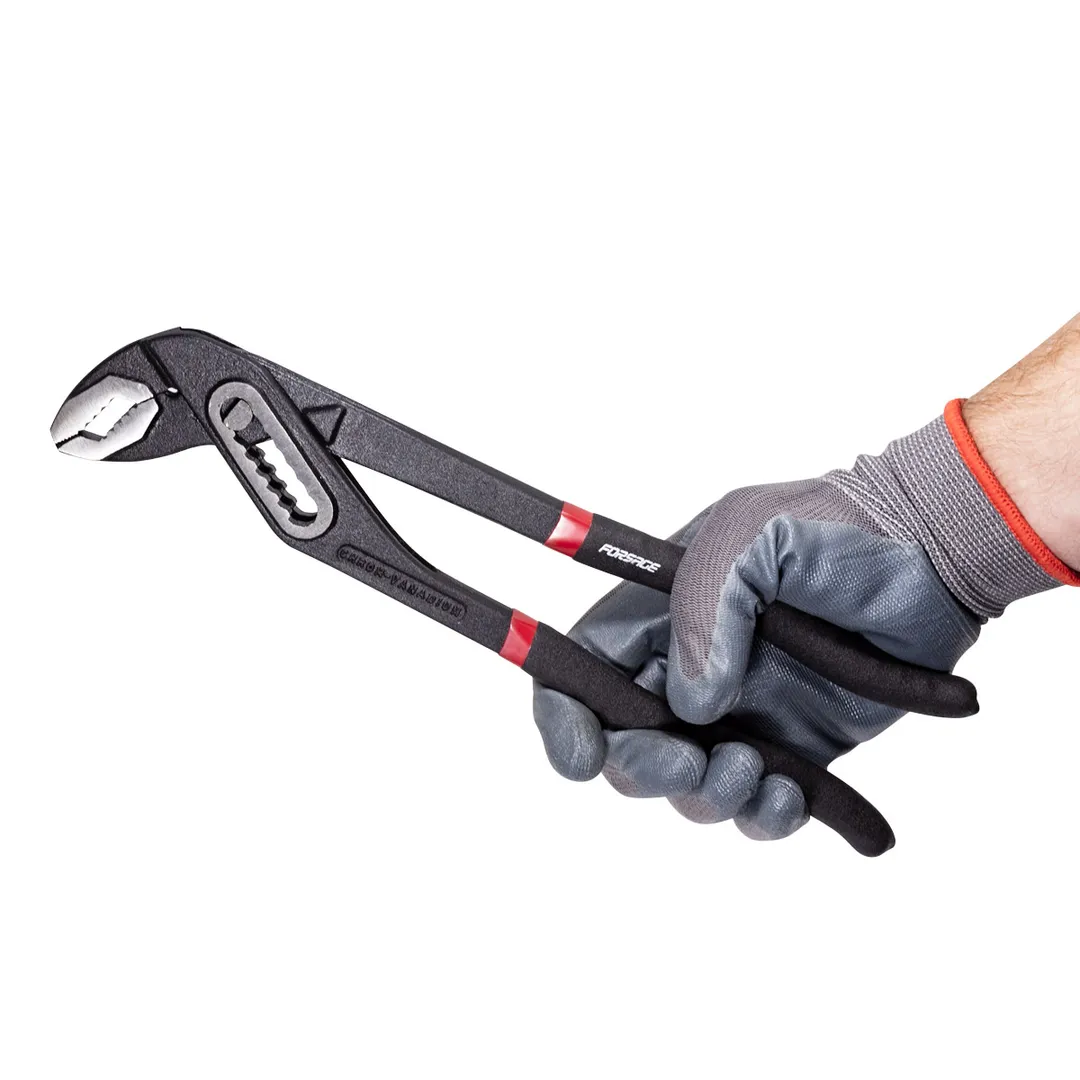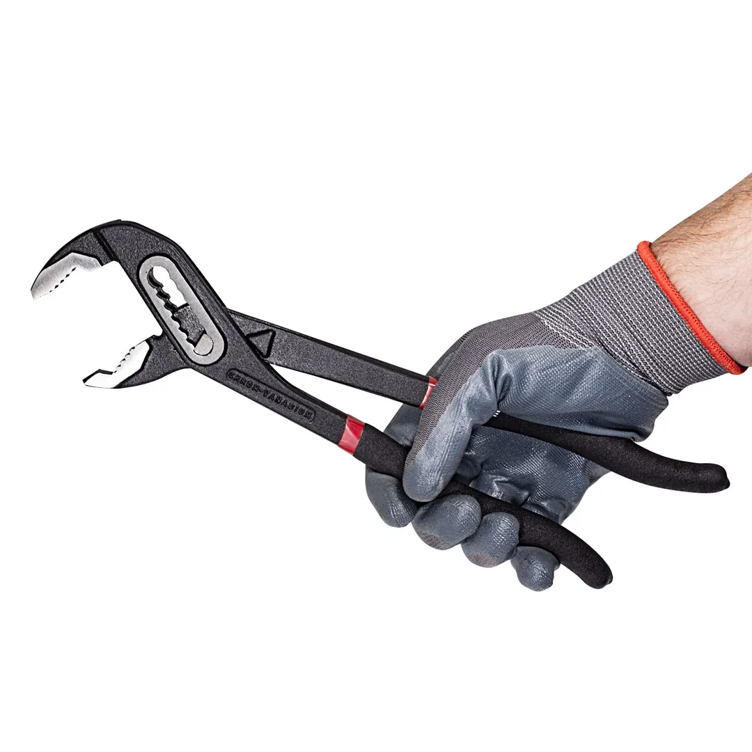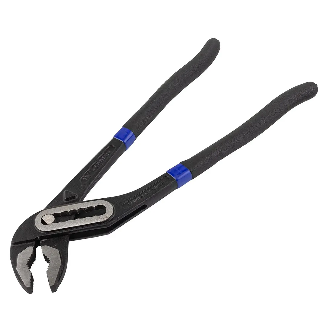 Пассатижи переставные имеют длину 300 мм. Универсальные губки позволяют захватывать предметы любой формы- круглые, квадратные, шестигранные или плоские. Эргономичная рукоятка выполнена из пластика с матовым покрытием, что повышает комфорт и минимизирует скольжение рук при использовании. Защита пальцев от защемления поможет избежать травм. Хромованадиевая сталь, из которой изготовлены пассатижи, обеспечивает прочность и долговечность, а также оптимальные режущие свойства и срок службы.