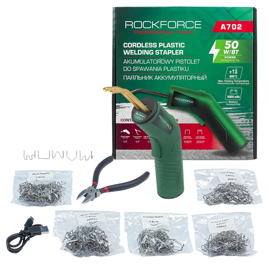 Паяльник аккумуляторный беспроводной от бренда RockFORCE (50W, 3.7V, макс. тем-ра 800град./С) предназначен для устранения трещин, разрывов, разломов, ремонта различных пластиковых деталей и других изделий из пластика путем их армирования металлическими скобами. Установив скобы для пайки пластика, можно ремонтировать горизонтальные, вертикальные, длинные и короткие трещины.