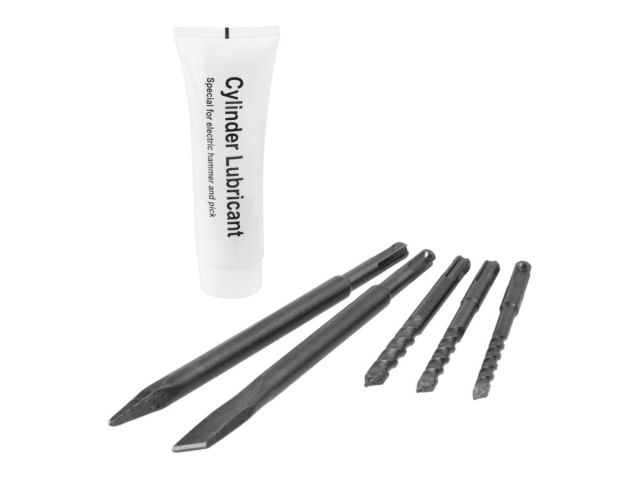 Перфоратор поставляется в надежном пластиковом кейсе вместе с 3 сверлами и 2 зубилами.