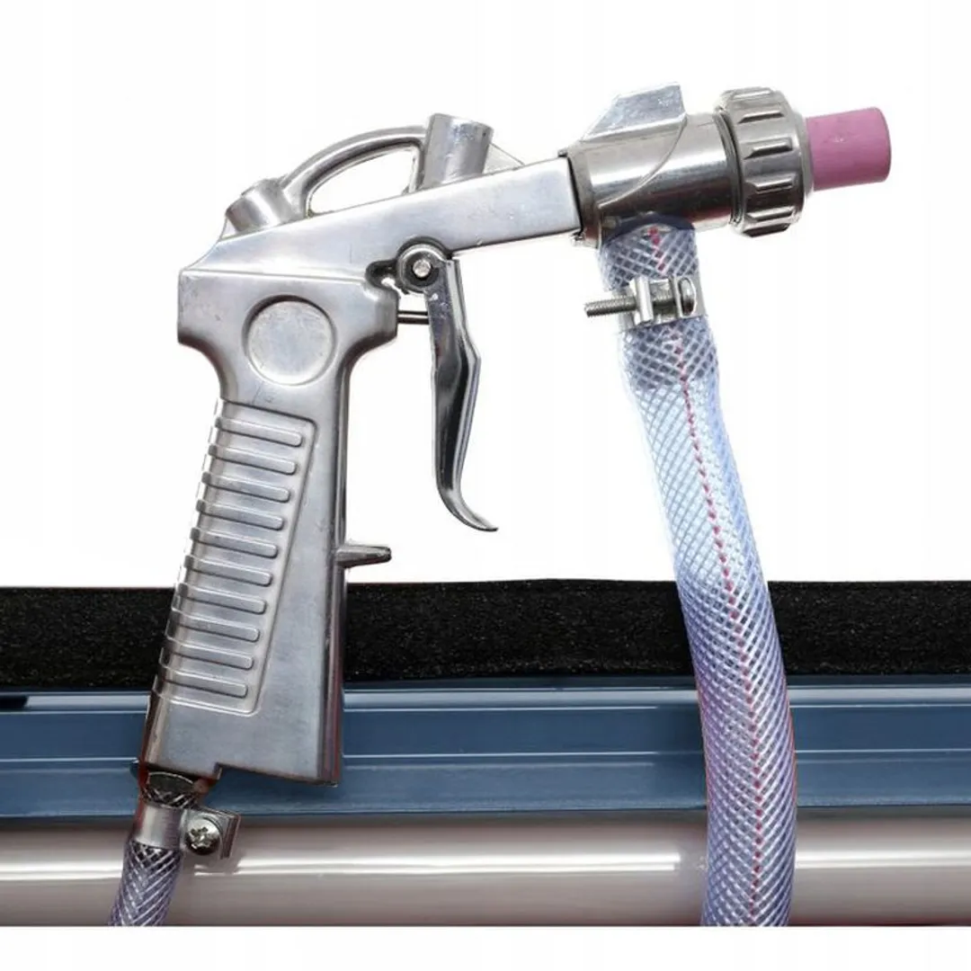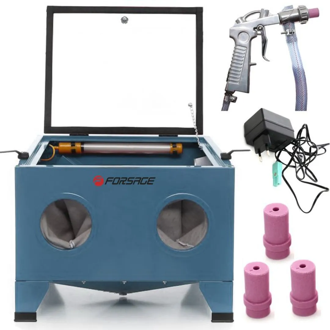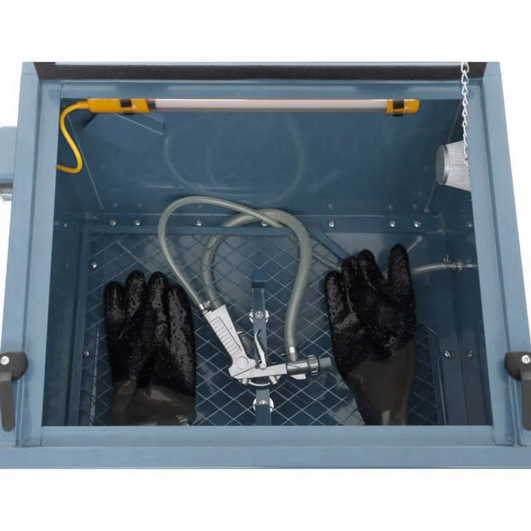 Пескоструйная камера пневматическая настольная объемом 90 литров. Рабочее давление 6 - 8 бар. Расход воздуха 66,7-133,3 л/мин. Подсветка - 220 В, 50 Гц. Диаметры сопел 4, 5, 6, 7мм. Длина воздушного шланга 0,71м, длина шланга под абразив 0,68м. Характеристики: - используется для обработки поверхности небольших деталей; - конструкция закрытого типа, экономичное использование песка, экологически чистое; - большое прозрачное смотровое окно, оборудована подсветкой; - удобно загружать детали на обработку. Предназначена для: снятия ржавчины, грунта, слоев краски, следов коррозии, матирования.