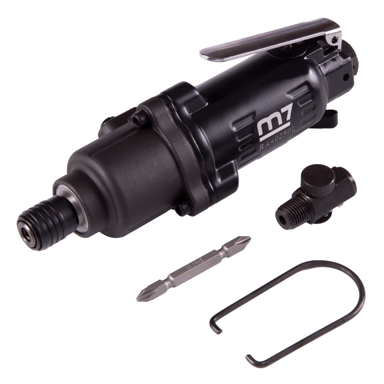 - Шуруповерт прямого действия оснащен скобой для подвеса, что удобно для использования инструмента в мелкосерийном и серийном производстве.