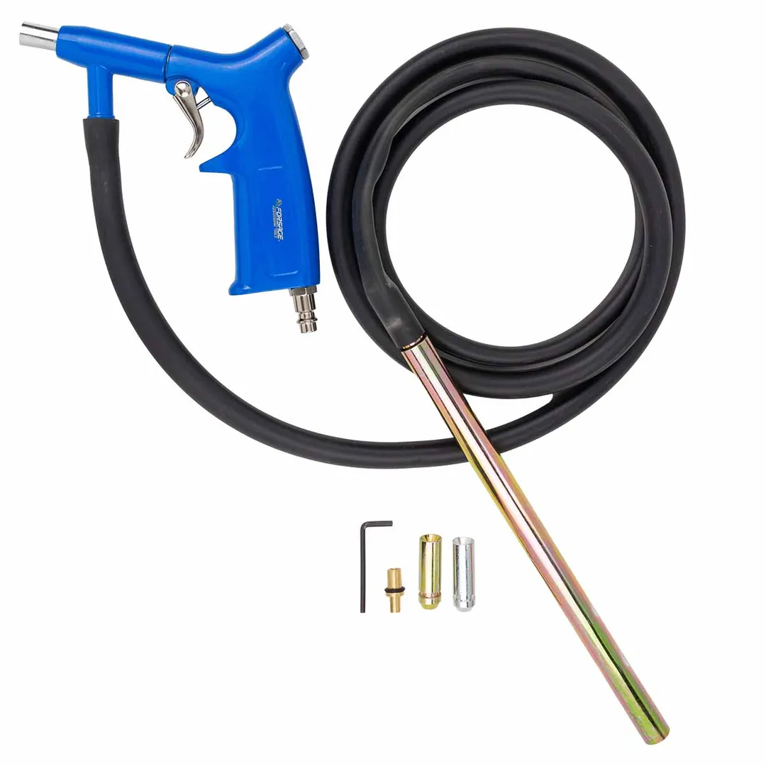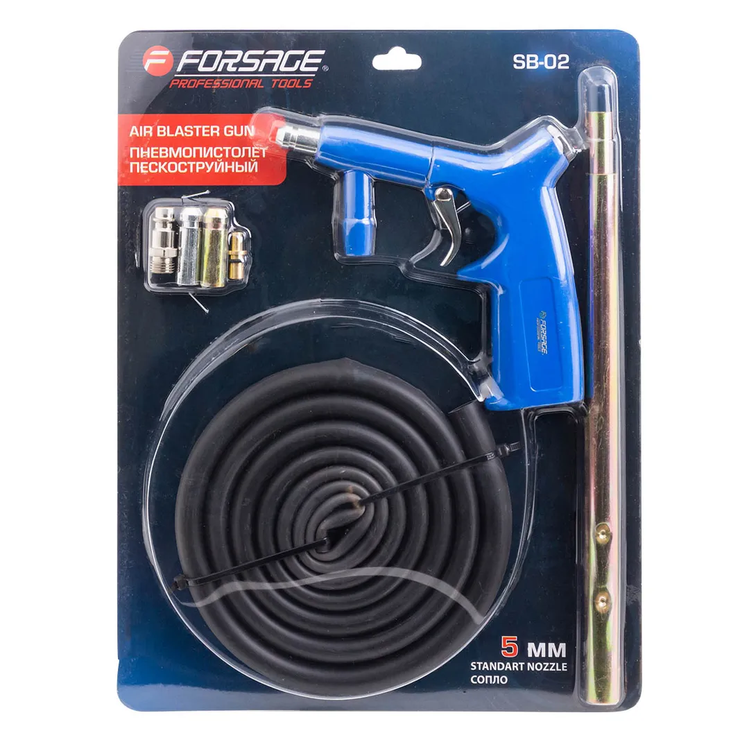 Пистолет пескоструйный предназначен для слесарных работ, таких как обработка металлических поверхностей изделий от коррозии, лака, краски и других покрытий. Обработка металлических поверхностей потоком частиц песка в струе сжатого воздуха позволяет эффективно удалять с них ржавчину, окалину, лаковые покрытия, застарелую краску и отвердевшую масляно-пылевую пленку. Важнейшим элементом инжекторной технологии струйной очистки изделий и деталей является пескоструйный пистолет со сменными соплами. В отличие от моделей с собственным бачком для абразива, которые пригодны только для локальной обработки конструкций, предлагаемое изделие относится к пистолетам пескоструйным шлангового типа. Данное устройство имеет 2 входа для присоединения шлангов подачи сжатого воздуха и абразива и держатель керамического или металлическое сопла. Учитывая, что изменение формы и диаметра выходного отверстия струйного инжектора позволяет вести обработку объектов в различных режимах, пистолет пескоструйный (3 сменных сопла) имеет преимущ