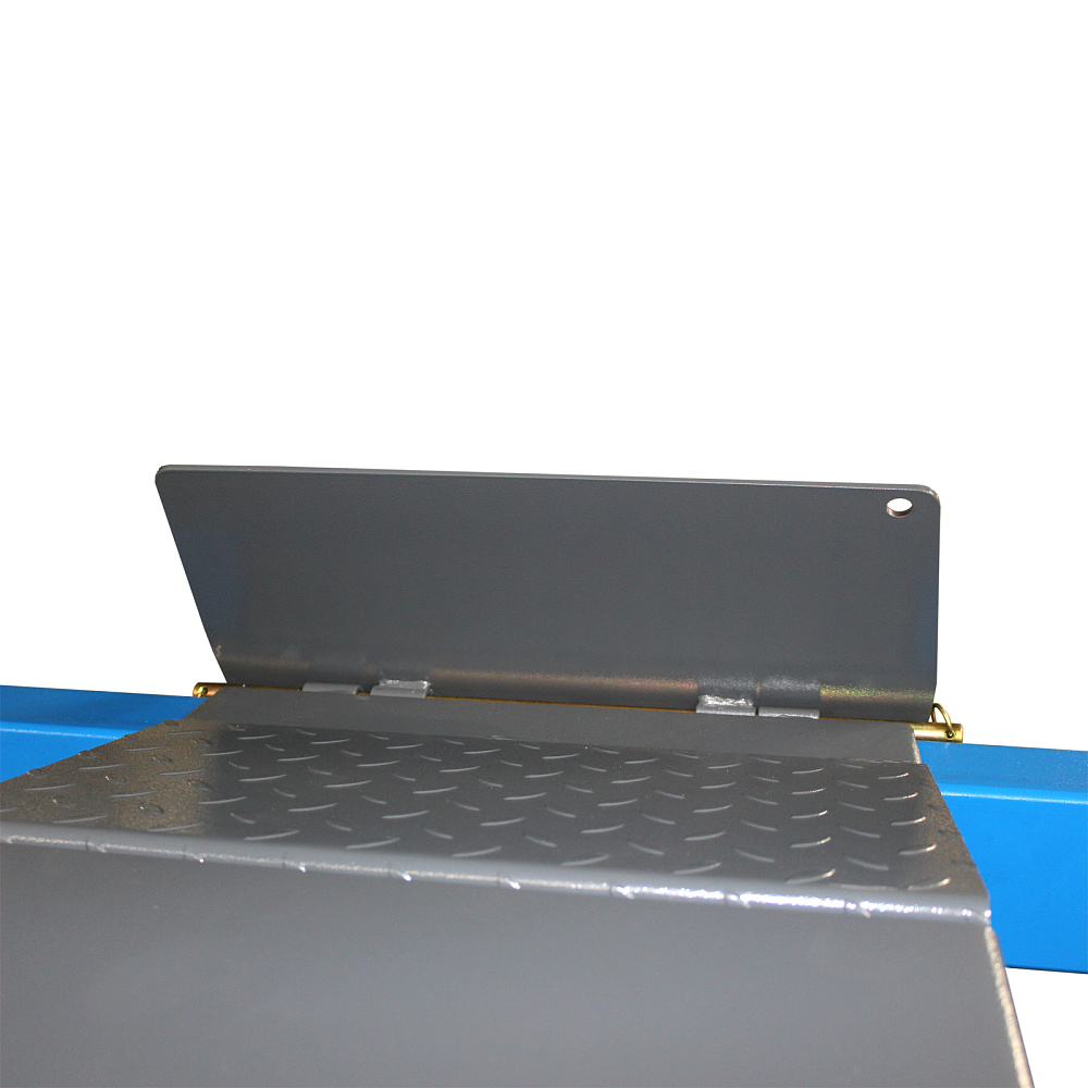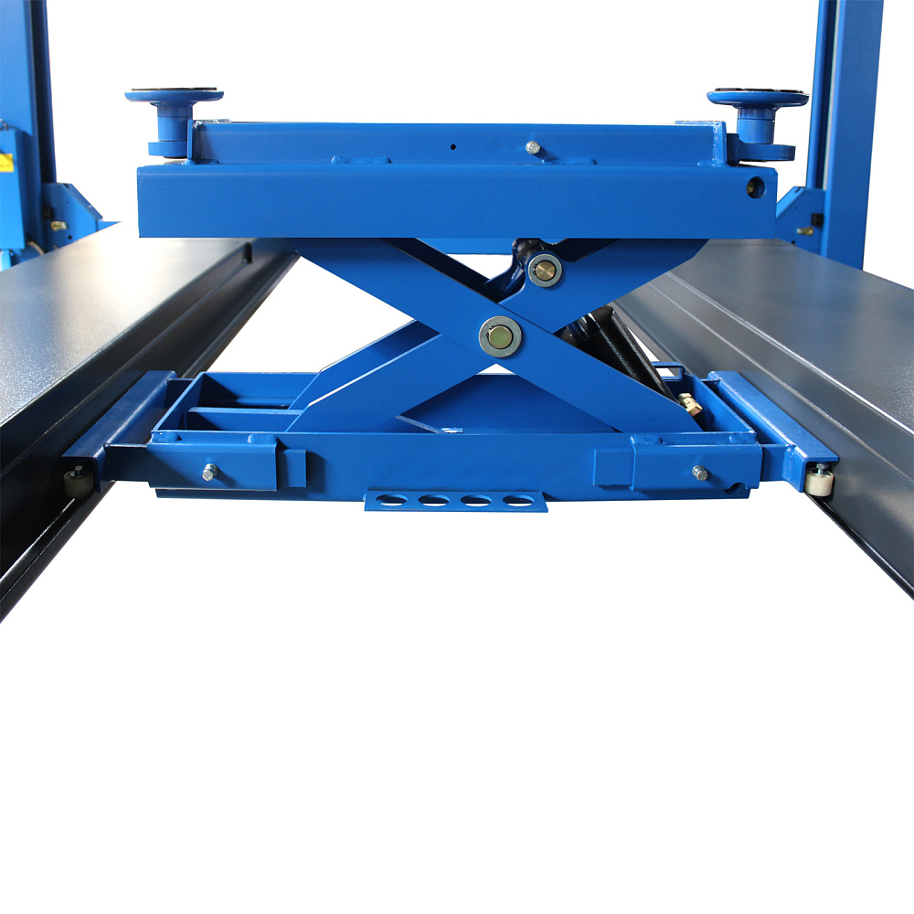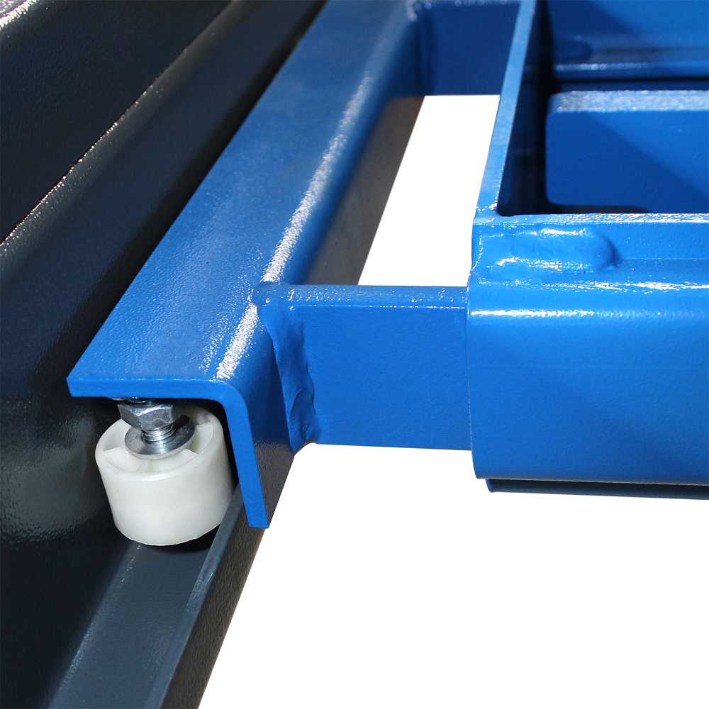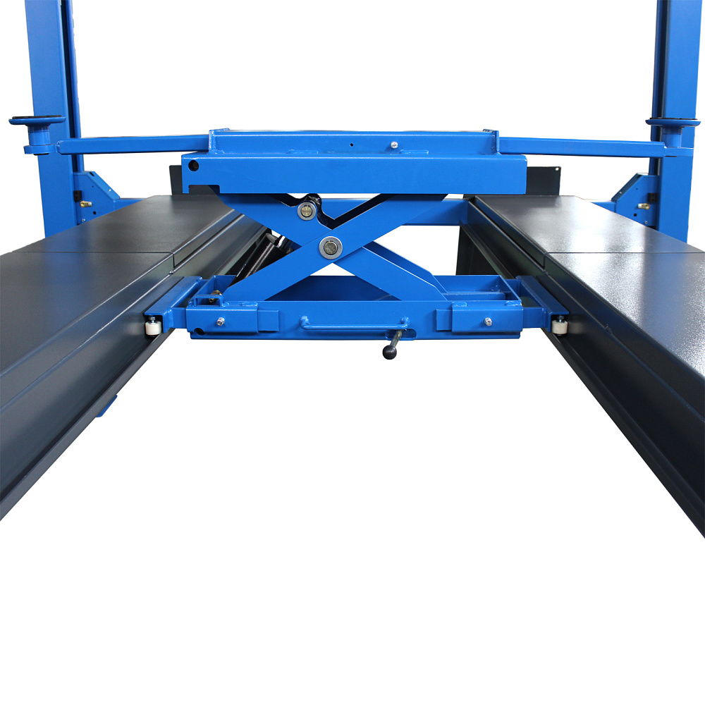 Оборудование приводится в действие гидравлическими цилиндрами и системой стальных тросов, что дает невысокий уровень шума. Данная модификация включает набор скользящих пластин и поворотных дисков, а также траверсу для реализации работ по развалу-схождению колес.