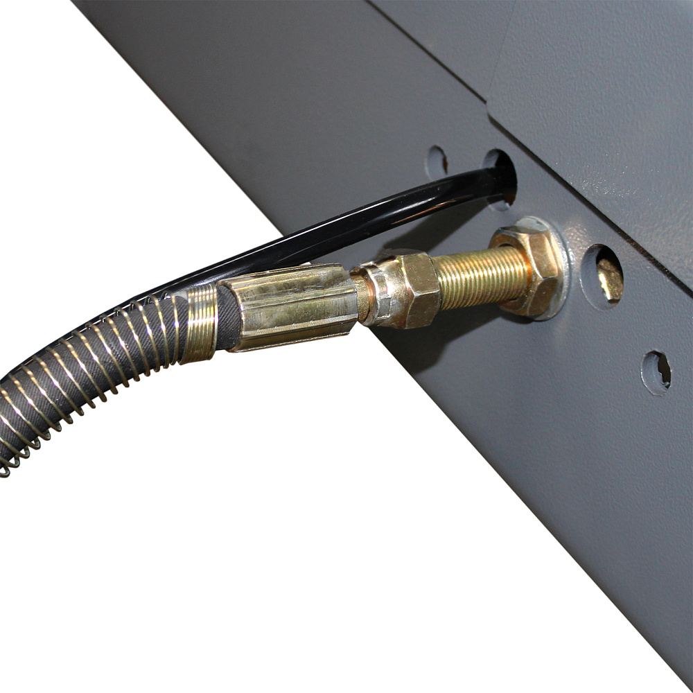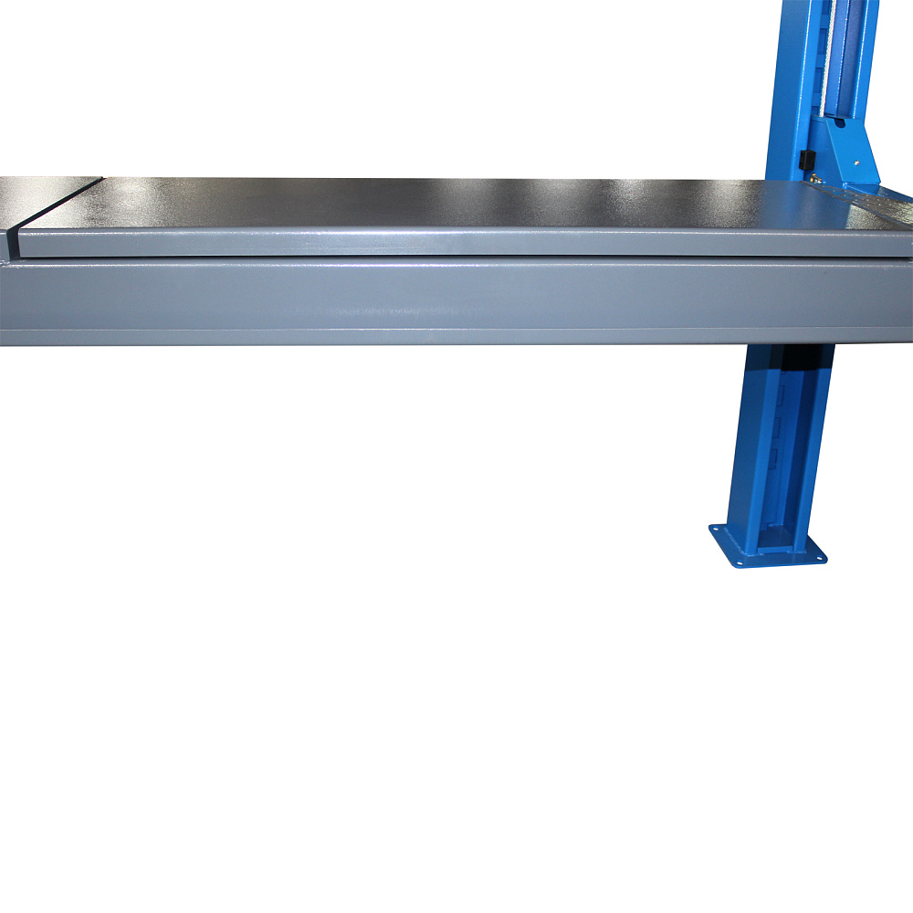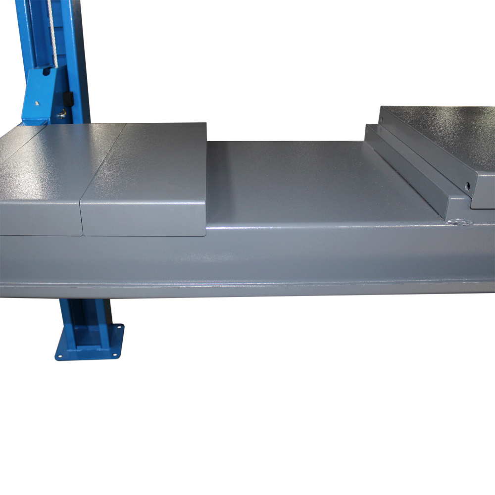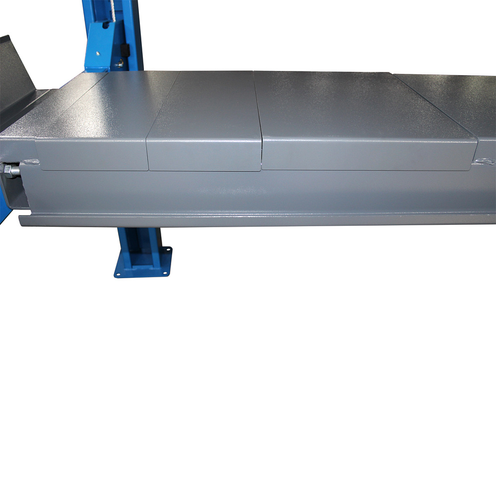 Оборудование приводится в действие гидравлическими цилиндрами и системой стальных тросов, что дает невысокий уровень шума. Данная модификация включает набор скользящих пластин и поворотных дисков, а также траверсу для реализации работ по развалу-схождению колес.