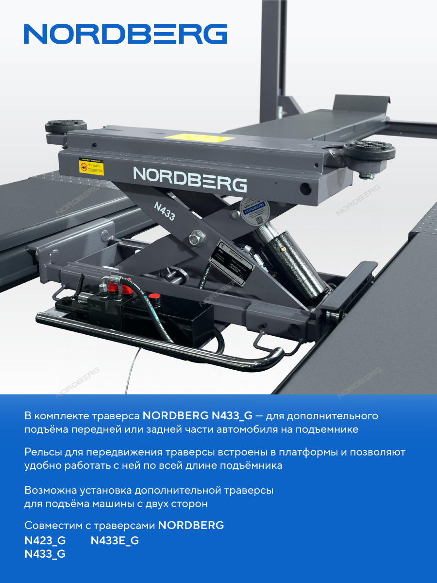 - В комплекте присутствует траверса NORDBERG N433G. Также имеется возможность приобрести дополнительную траверсу для подъема машины с двух сторон;