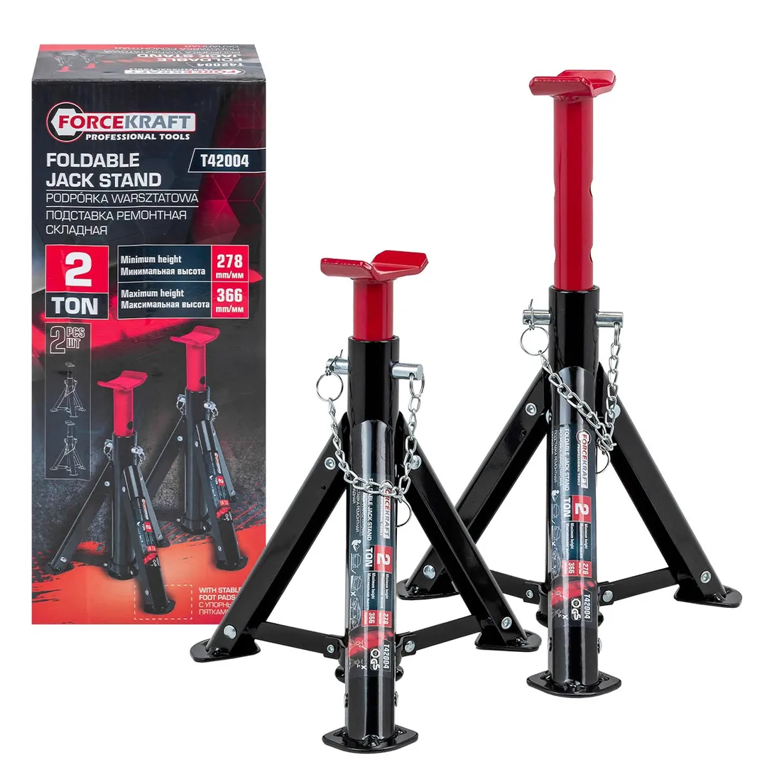 Максимальная нагрузка 2 тонны (2000 кг). Минимальная высота или высота подхвата: 278 мм. Максимальная высота: 366 мм. В комплект входят 2 подставки.
