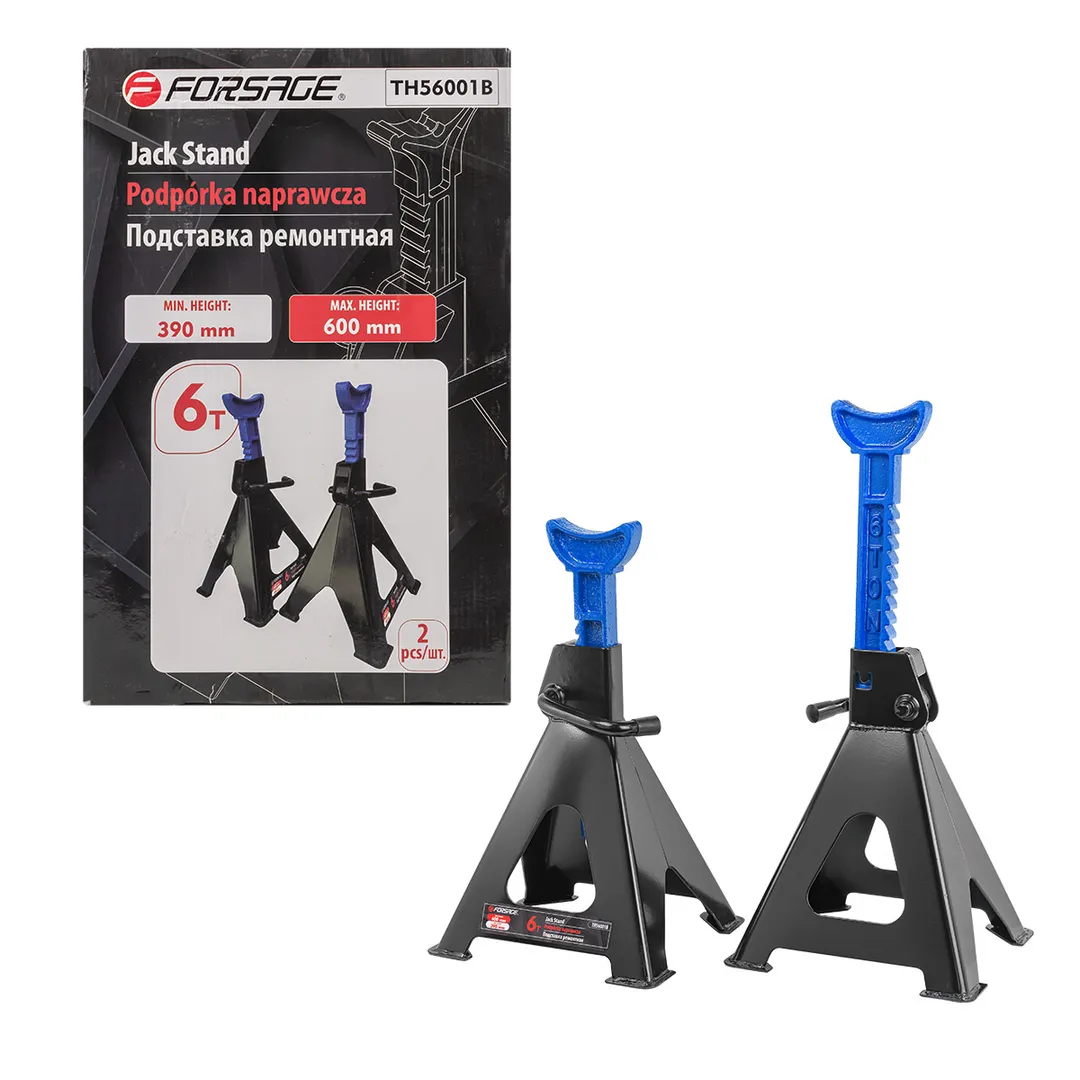 Максимальная нагрузка 6 тонн (6000 кг). Минимальная высота или высота подхвата: 390 мм. Максимальная высота: 600 мм. В комплект входят 2 подставки.