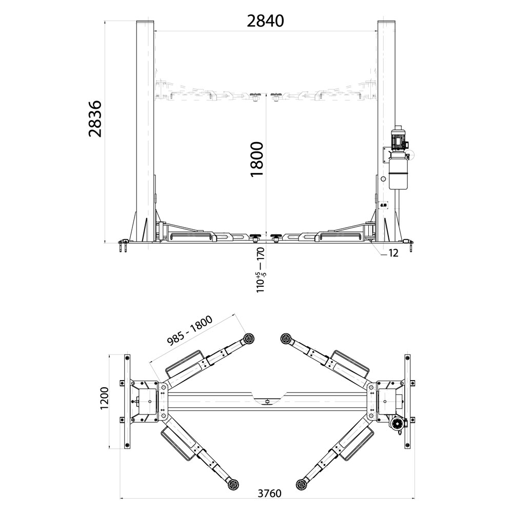 Общая ширина подъемника - 3760 мм.