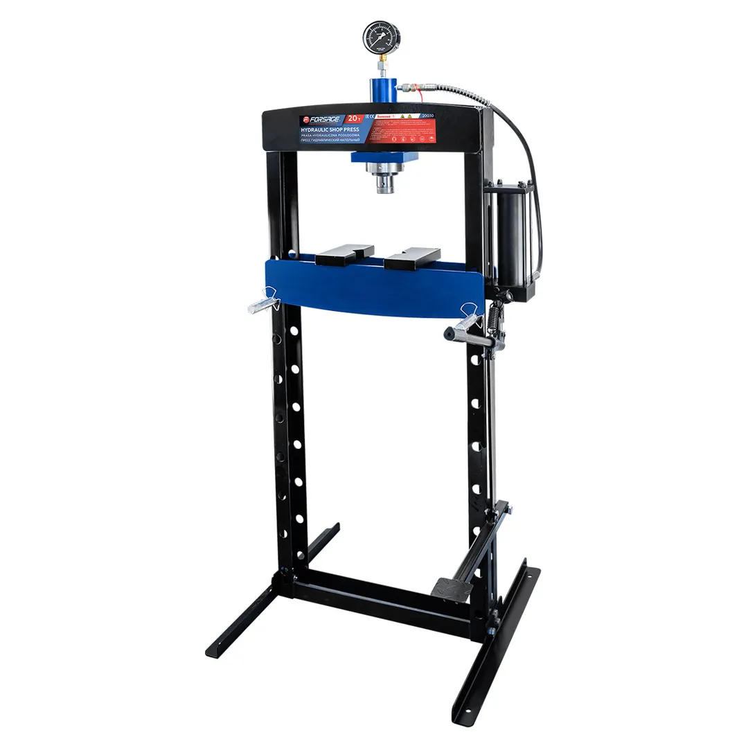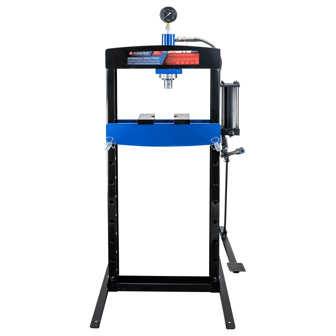 Пресс гидравлический напольный Forsage — это профессиональное оборудование грузоподъемностью 20 тонн, предназначенное для выполнения тяжелых слесарных и ремонтных работ, включая запрессовку и выпрессовку подшипников, шкивов, сайлент-блоков, а также правку металлоконструкций. Конструкция пресса обладает усиленной стальной рамой, обеспечивающей максимальную устойчивость и безопасность при работе с высокими нагрузками. Рабочий диапазон высоты составляет от 95 мм до 1055 мм при ширине между стойками 545 мм, что позволяет работать с заготовками различных габаритов. Ход штока составляет 154 мм, обеспечивая достаточную амплитуду для выполнения прессовочных операций. Оборудование предназначено для использования строго по назначению на твердой, ровной и устойчивой поверхности с обязательным креплением к полу.