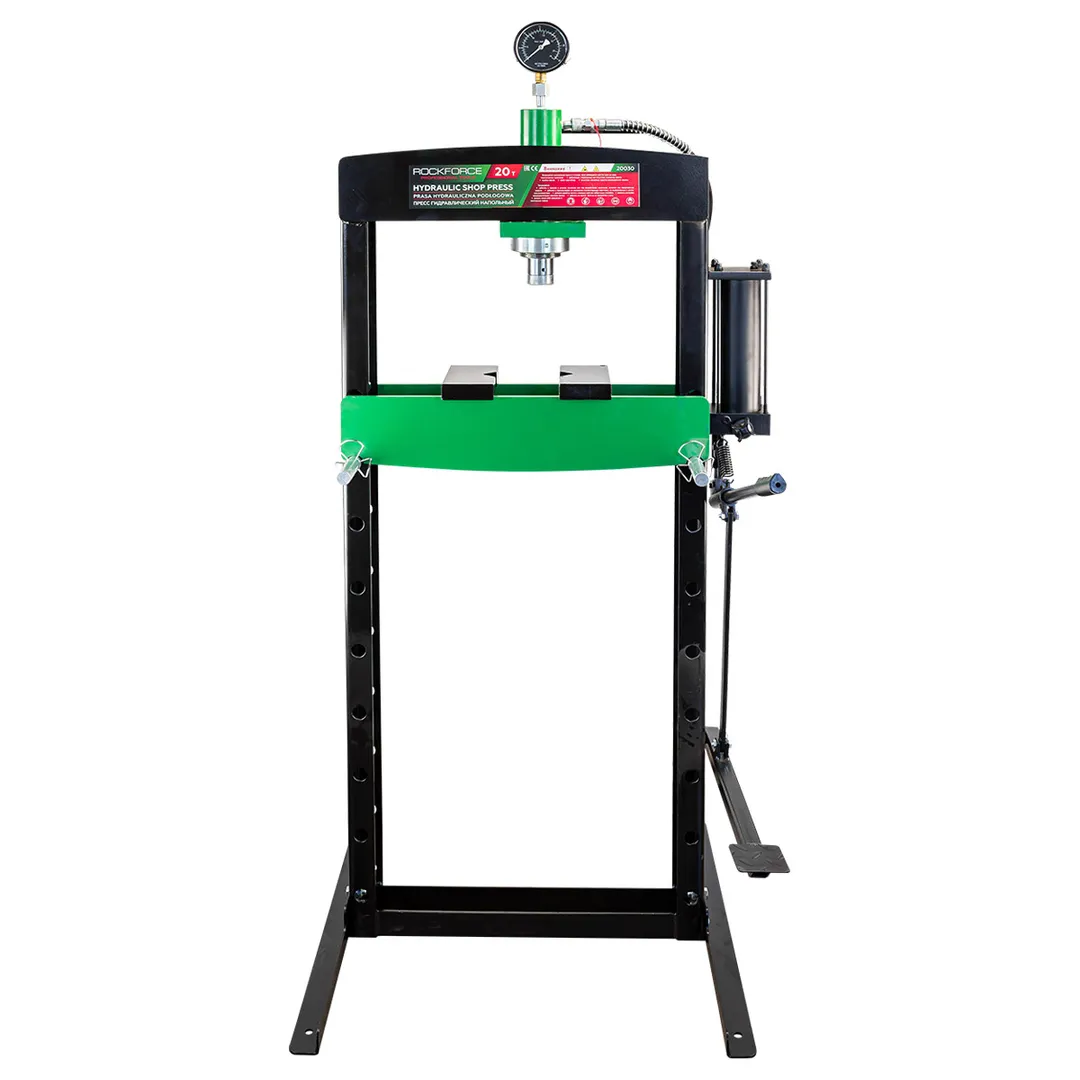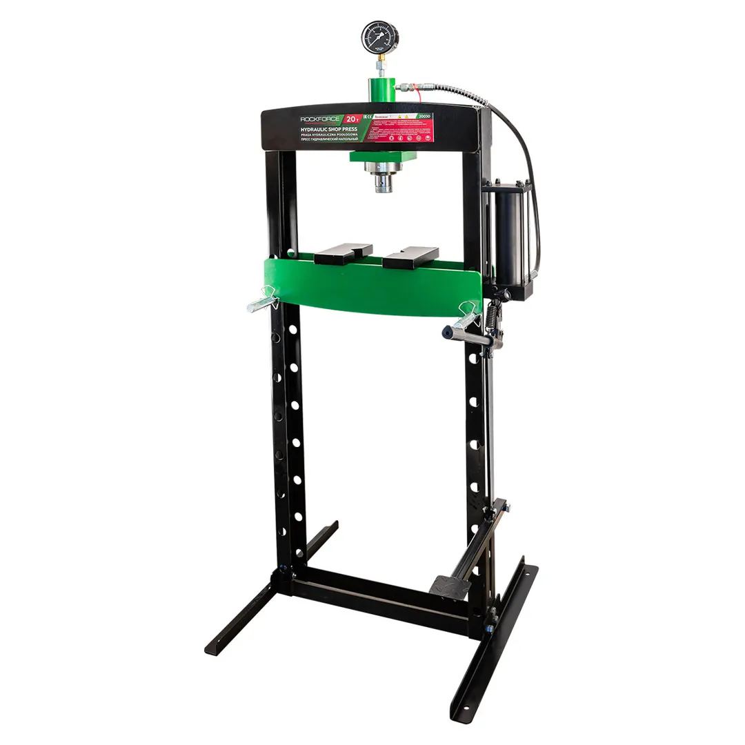 Пресс гидравлический напольный ROCKFORCE — это профессиональное оборудование грузоподъемностью 20 тонн, предназначенное для выполнения тяжелых слесарных и ремонтных работ, включая запрессовку и выпрессовку подшипников, шкивов, сайлент-блоков, а также правку металлоконструкций. Конструкция пресса обладает усиленной стальной рамой, обеспечивающей максимальную устойчивость и безопасность при работе с высокими нагрузками. Рабочий диапазон высоты составляет от 95 мм до 1055 мм при ширине между стойками 545 мм, что позволяет работать с заготовками различных габаритов. Ход штока составляет 154 мм, обеспечивая достаточную амплитуду для выполнения прессовочных операций. Оборудование предназначено для использования строго по назначению на твердой, ровной и устойчивой поверхности с обязательным креплением к полу.