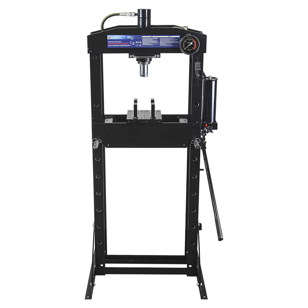 Напольный гидравлический пресс приводится в действие при помощи рукояти. Устойчивое положение модели обеспечивается благодаря поперечным пластинам основания. Отверстия стоек позволяют с легкостью менять высоту стола. Пресс также оснащён манометром, служащим для контролирования давления.