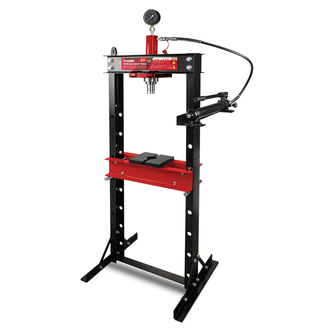 Напольный гидравлический пресс приводится в действие при помощи рукояти. Устойчивое положение модели обеспечивается благодаря поперечным пластинам основания. Отверстия стоек позволяют с легкостью менять высоту стола. Пресс также оснащён манометром, служащим для контролирования давления.