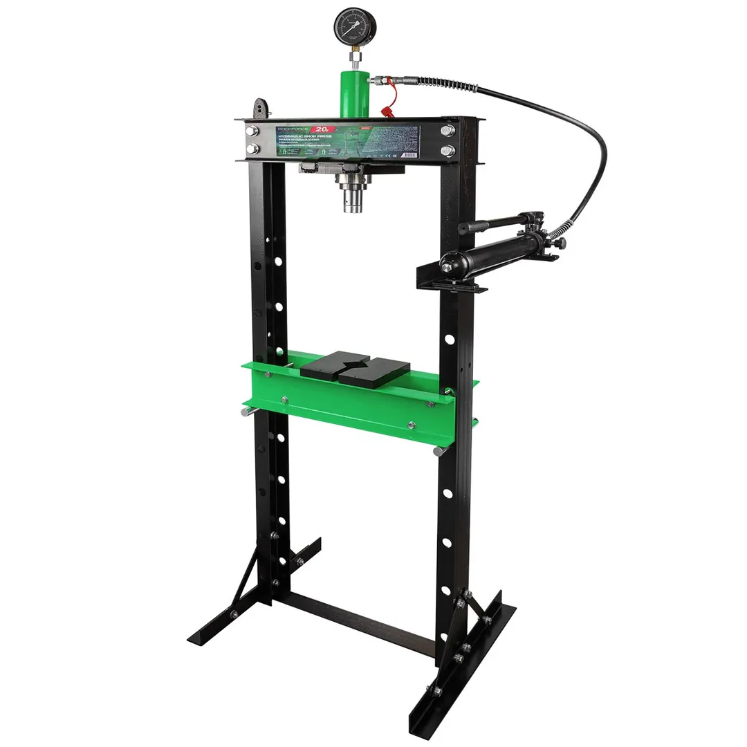 Напольный гидравлический пресс приводится в действие при помощи рукояти. Устойчивое положение модели обеспечивается благодаря поперечным пластинам основания. Отверстия стоек позволяют с легкостью менять высоту стола. Пресс также оснащён манометром, служащим для контролирования давления.
