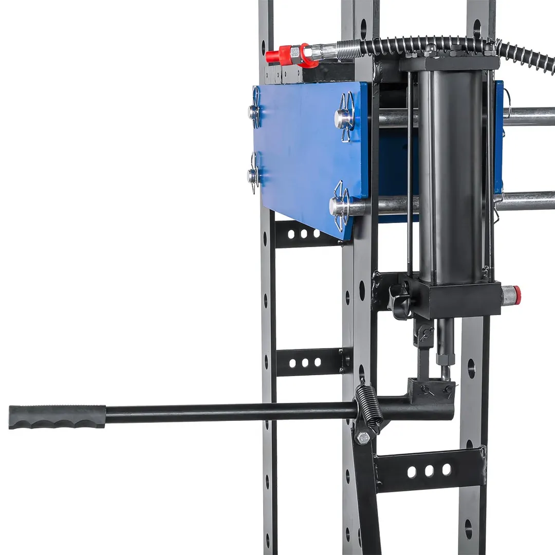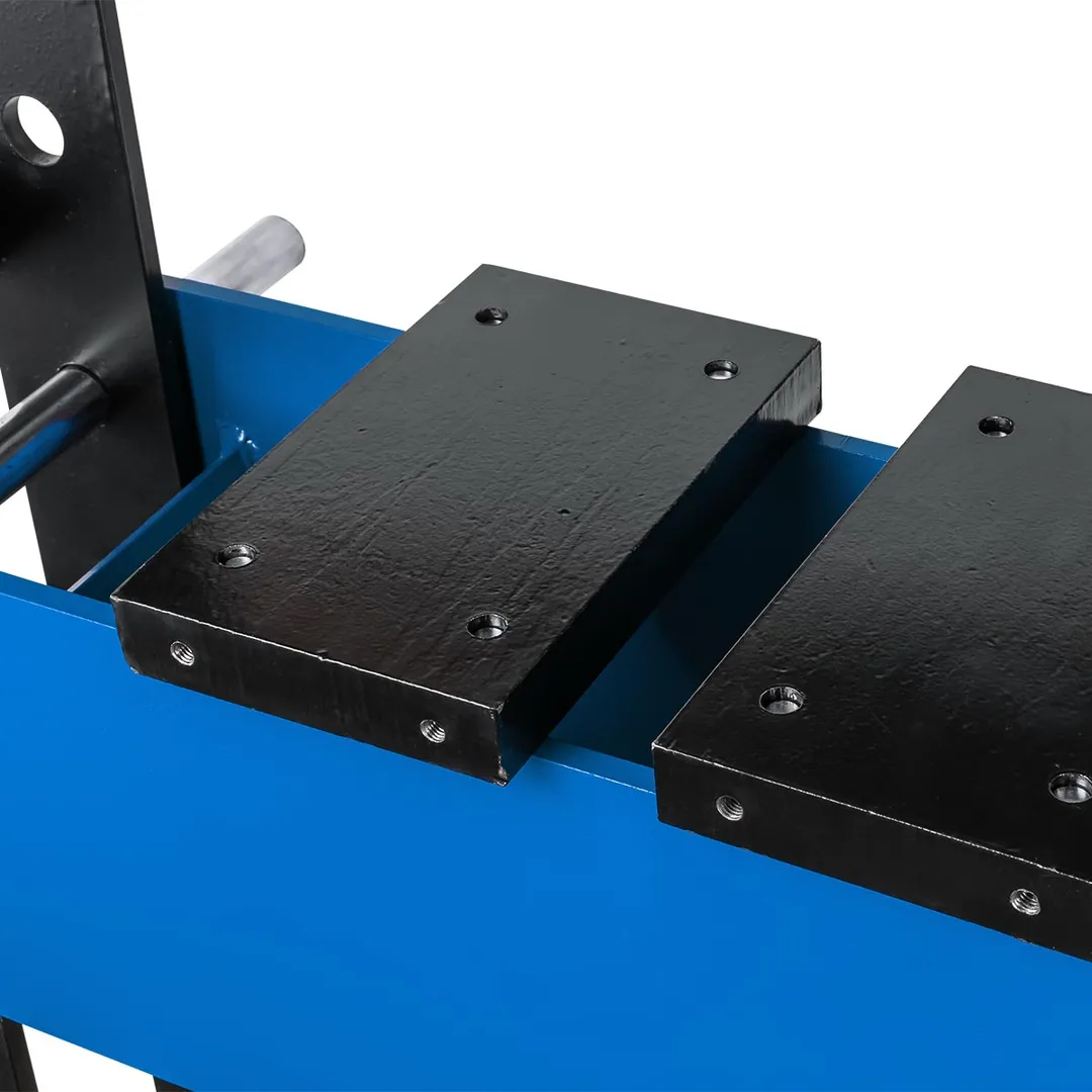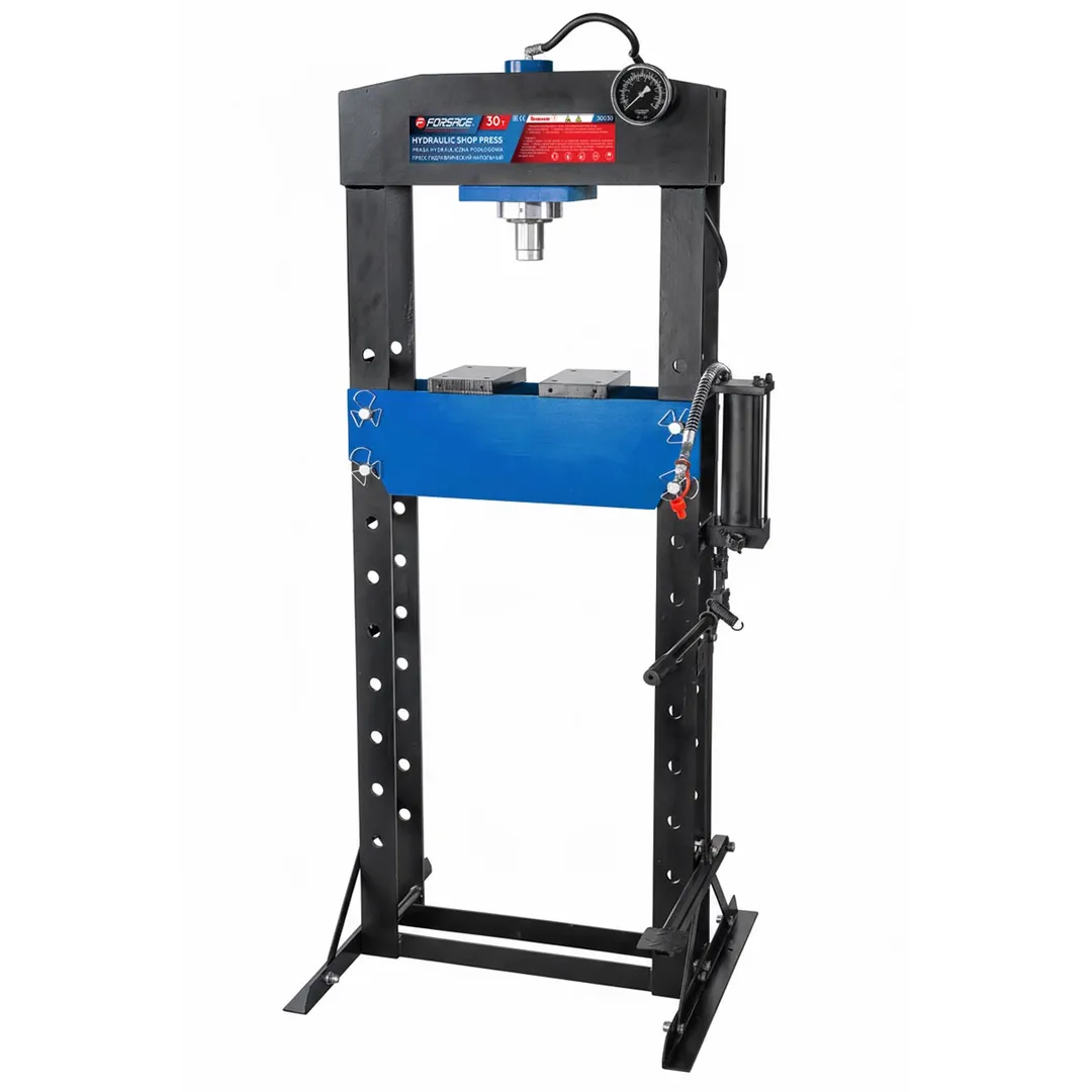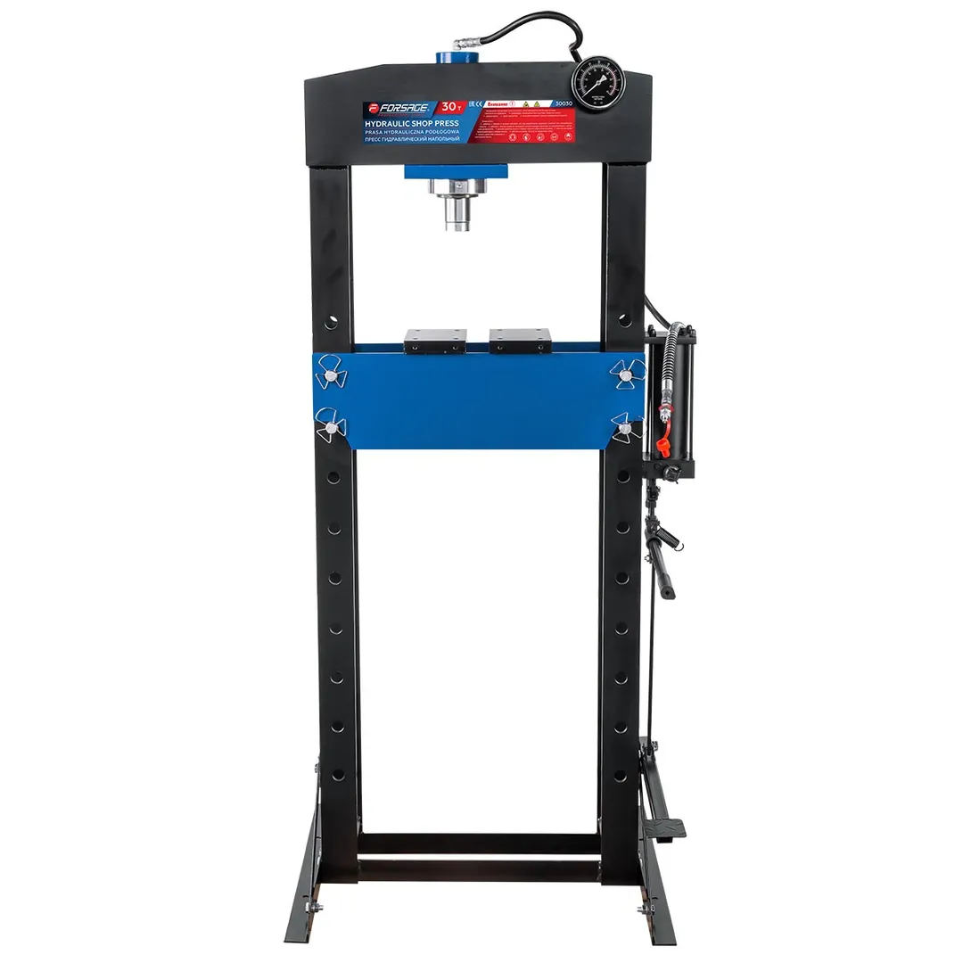 Пресс гидравлический напольный — это мощное и надежное профессиональное оборудование грузоподъемностью 30 тонн, предназначенное для выполнения различных видов работ, включая запрессовку и выпрессовку подшипников, шкивов, сайлент-блоков, а также операции сжатия, выгибания и прессования. Этот пресс идеально подходит для использования в автомастерских, промышленных предприятиях и других местах, где требуется мощное оборудование для работы с тяжелыми деталями и материалами. Напольный гидравлический пресс приводится в действие при помощи рукояти либо пневматически - насос пресса может подключаться к внешнему компрессору. Устойчивое положение модели обеспечивается благодаря прочной стальной раме и поперечным элементам основания. Отверстия стоек позволяют с легкостью менять высоту стола, обеспечивая рабочий диапазон высоты от 140 мм до 1020 мм при ширине между стойками 535 мм, что позволяет работать с деталями различных габаритов. Ход штока составляет 162 мм, обеспечивая достаточную амплитуду движения для выполнения