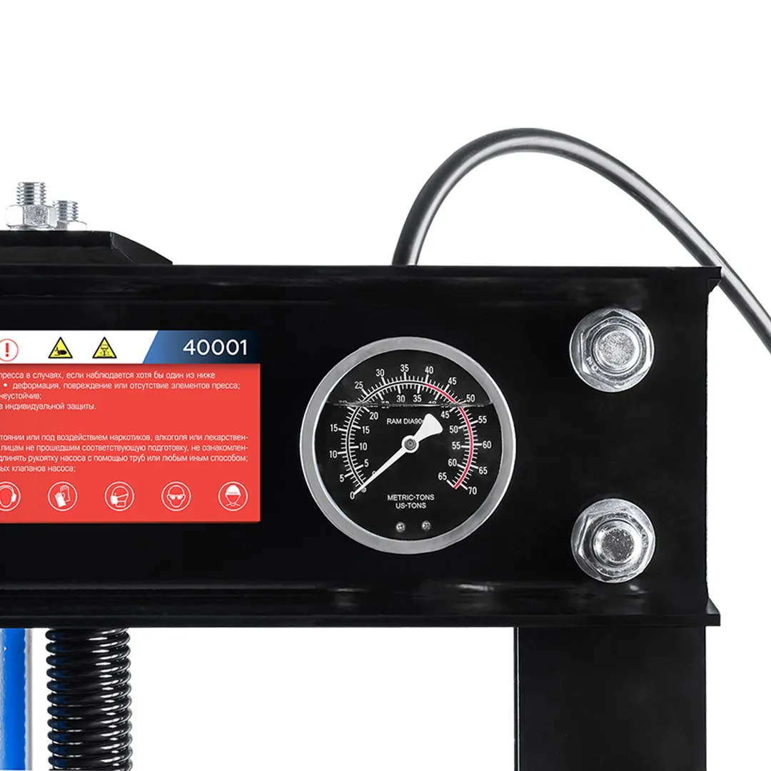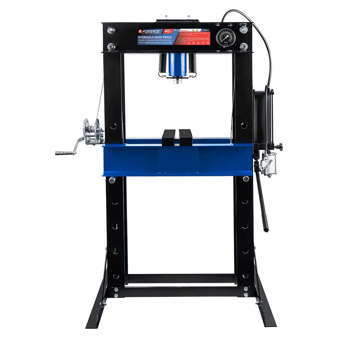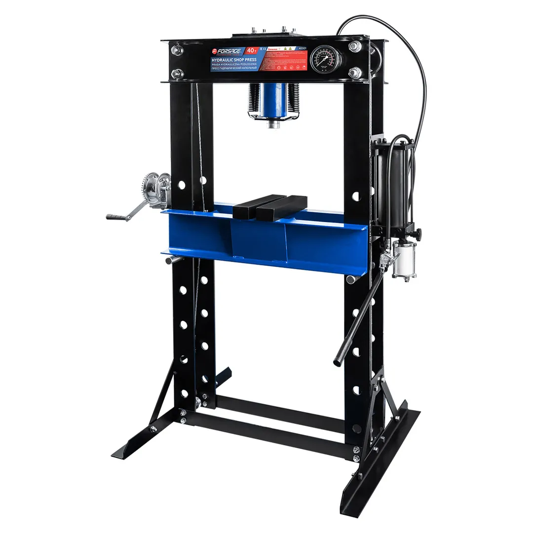Пресс гидравлический напольный — это мощное и надежное профессиональное оборудование грузоподъемностью 40 тонн, предназначенное для выполнения различных слесарных и ремонтных работ, включая запрессовку и выпрессовку подшипников, шкивов, сайлент-блоков и других операций, требующих приложения значительного усилия. Конструкция пресса обеспечивает устойчивость на полу благодаря прочной стальной раме и поперечным элементам основания. Рабочий диапазон высоты составляет от 45 мм до 945 мм при ширине между стойками 645 мм, что позволяет работать с деталями различных габаритов. Ход штока составляет 160 мм, обеспечивая достаточную амплитуду движения для выполнения большинства прессовочных операций. Для точного контроля прилагаемого усилия пресс оснащен стрелочным манометром. Оборудование приводится в действие с помощью ручного гидравлического насоса и оснащено системой безопасности, включая предохранительный клапан. Для использования строго по назначению на твердой и ровной поверхности.